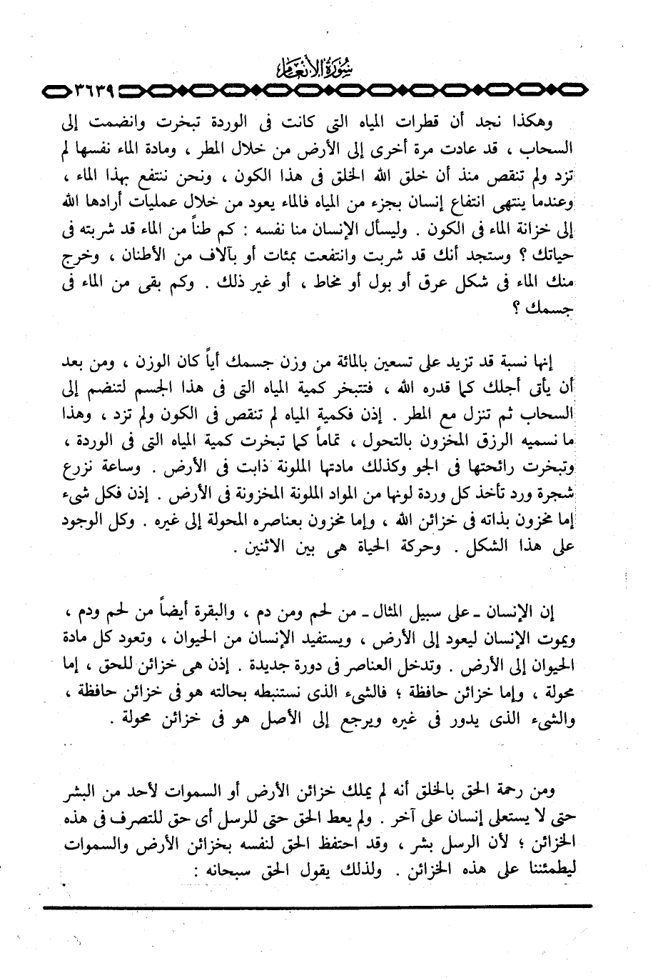 وهكذا نجد أن قطرات المياه التي كانت في الوردة تبخرت وانضمت إلى السحاب، قد عادت مرة أخرى إلى الأرض من خلال المطر، ومادة الماء نفسها لم تزد ولم تنقص منذ أن خلق الله الخلق في هذا الكون، ونحن ننتفع بهذا الماء، وعندما ينتهي انتفاع إنسان بجزء من المياه فالماء يعود من خلال عمليات أرادها الله إلى خزانة الماء في الكون. وليسأل الإنسان منا نفسه: كم طناً من الماء قد شربته في حياتك؟ وستجد أنك قد شربت وانتفعت بمئات أو بآلاف من الأطنان، وخرج منك الماء في شكل عرق أو بول أو مخاط، أو غير ذلك. وكم بقي من الماء في جسمك؟