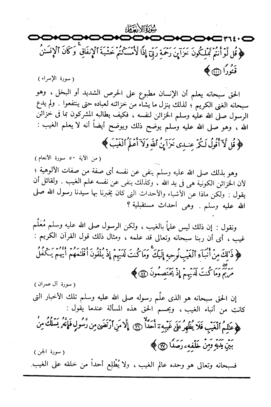 وهو بذلك صَلَّى اللَّهُ عَلَيْهِ وَسَلَّم َ ينفي عن نفسه أي صفة من صفات الألوهية؛ لأن الخزائن الكونية هي في يد الله، وكذلك ينفي عن نفسه علم الغيب. ولقائل أن يقول: ولكن ماذا عن الأشياء والأحداث التي كان يخبرنا بها سيدنا رسول الله صَلَّى اللَّهُ عَلَيْهِ وَسَلَّم َ. وهي أحداث مستقبلية؟