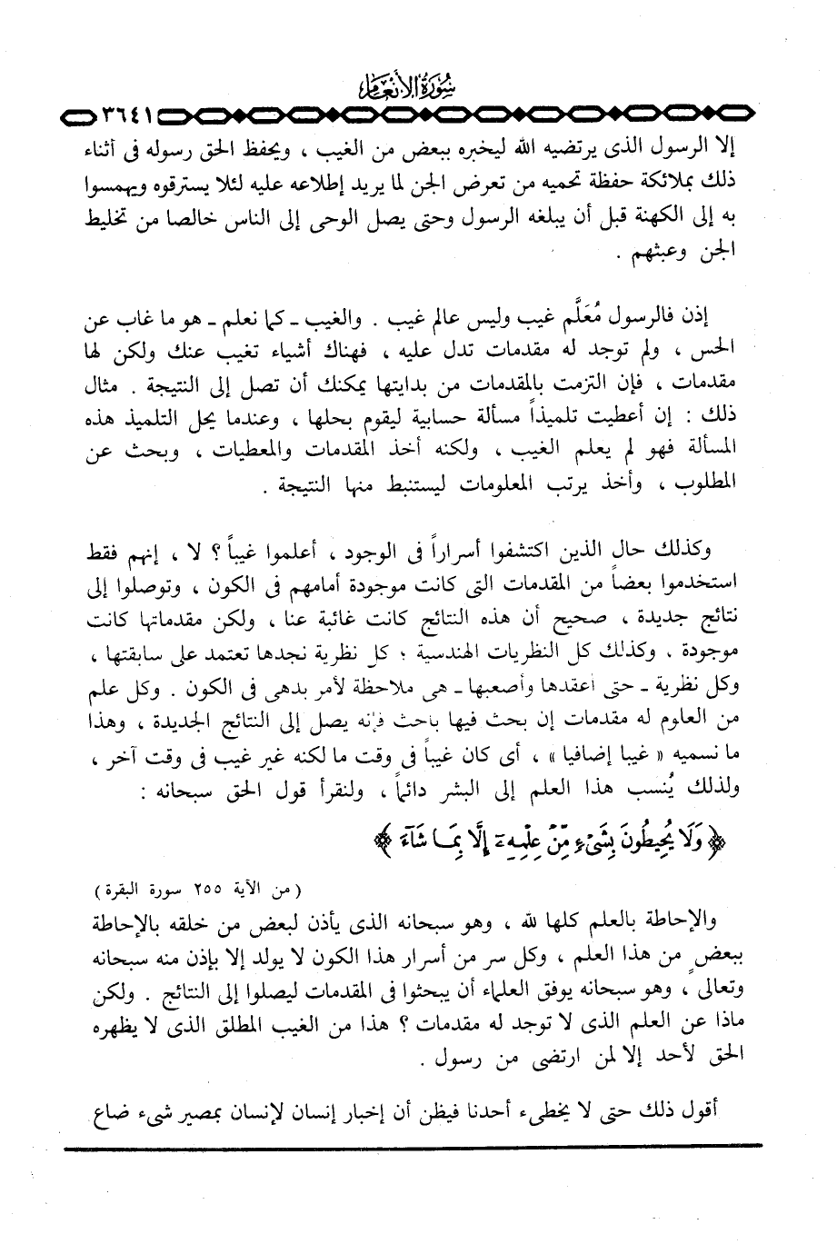 وكذلك حال الذين اكتشفوا أسراراً في الوجود، أعلموا غيباً؟ لا، إنهم فقط استخدموا بعضاً من المقدمات التي كانت موجودة أمامهم في الكون، وتوصلوا إلى نتائج جديدة، صحيح أن هذه النتائج كانت غائبة عنا، ولكن مقدماتها كانت موجودة، وكذلك كل النظريات الهندسية، كل نظرية نجدها تعتمد على سابقتها، وكل نظرية - حتى أعقدها وأصعبها - هي ملاحظة لأمر بدهي في الكون.