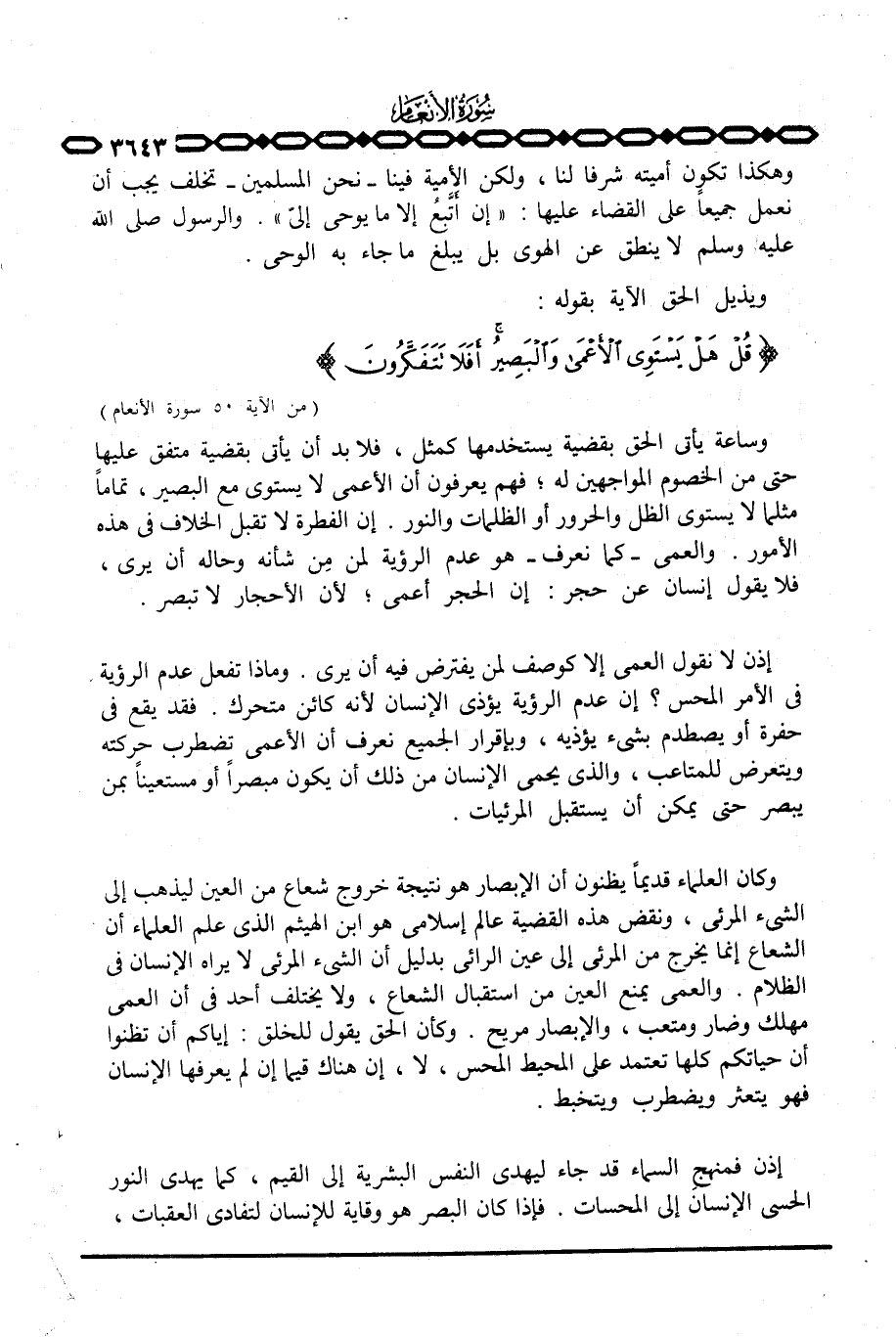وكان العلماء قديماً يظنون أن الإبصار هو نتيجة خروج شعاع من العين ليذهب إلى الشيء المرئي ونقض هذه القضية عالم إسلامي هو ابن الهيثم الذي علم العلماء أن الشعاع إنما يخرج من المرئي إلى عين الرائي بدليل أن الشيء المرئي لا يراه الإنسان في الظَّلام. والعمى يمنع العين من استقبال الشعاع، ولا يختلف أحد في أن العمى مهلك وضار ومتعب، والإبصار مريح. وكأن الحق يقول للخلق: إياكم أن تظنوا أن حياتكم كلها تعتمد على المحيط المحس، لا، إن هناك قيماً إن لم يعرفها الإنسان فهو يتعثر ويضطرب ويتخبط.