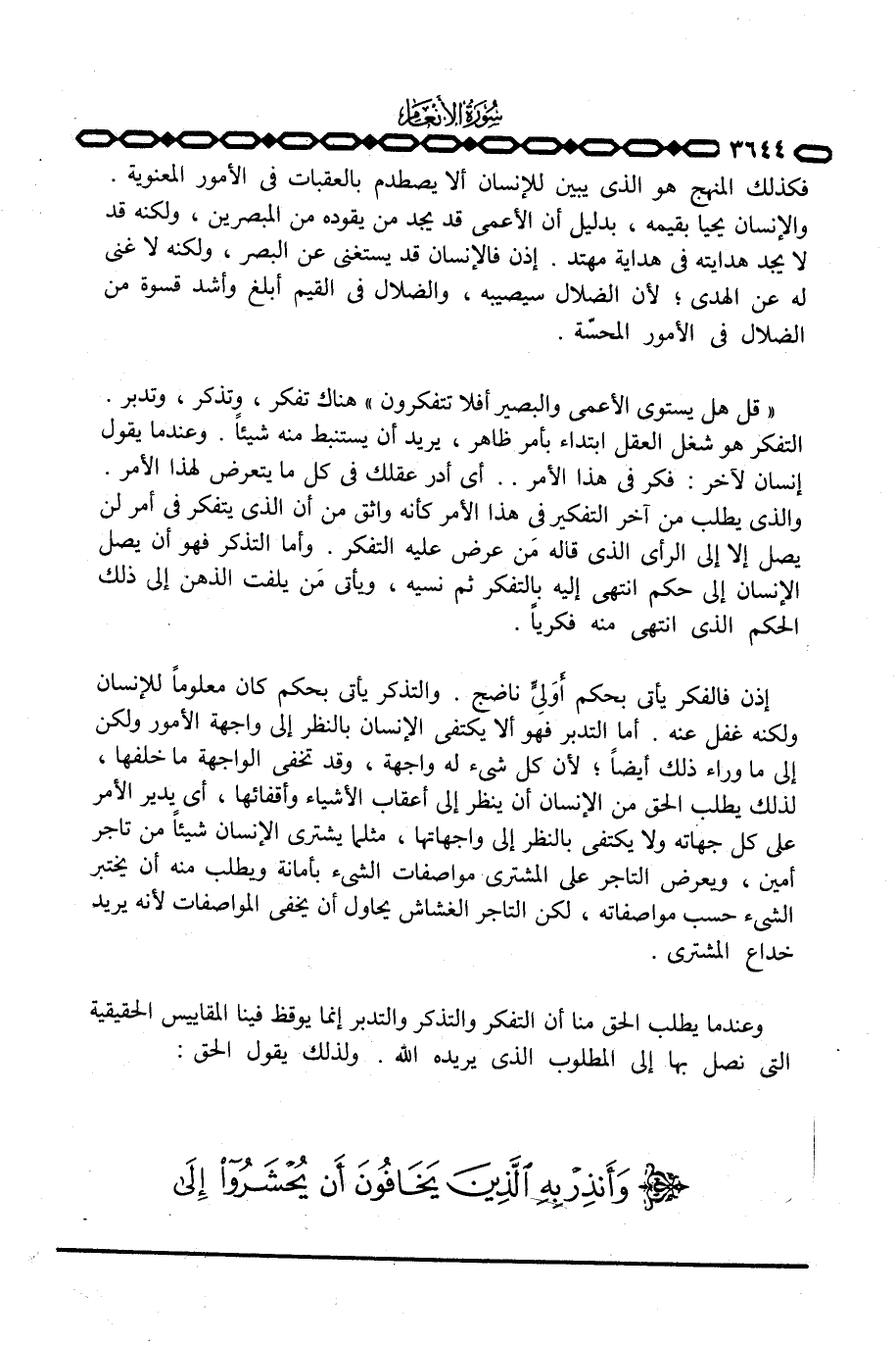 {قُلْ هَلْ يَسْتَوِي الأعمى والبصير أَفَلاَ تَتَفَكَّرُونَ} هناك تفكر، وتذكر، وتدبر. التفكر هو شغل العقل ابتداء بأمر ظاهر، يريد أن يستنبط منه شيئاً. وعندما يقول إنسان لآخر: فكر في هذا الأمر. . أي أدر عقلك في كل ما يتعرض لهذا الأمر. والذي يطلب من آخر التفكير في هذا الأمر كأنه واثق من أن الذي يتفكر في أمر لن يصل إلا إلى الرأي الذي قاله من عرض عليه التفكير. وأما التذكر فهو أن يصل الإنسان إلى حكم انتهى إليه بالتفكر ثم نسيه، ويأتي من يلفت الذهن إلى ذلك الحكم الذي انتهى منه فكرياً.
