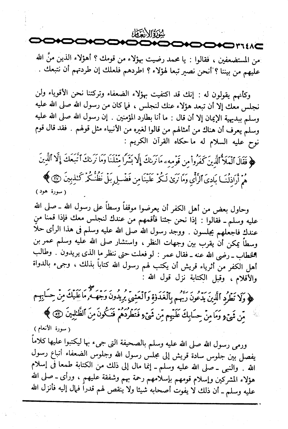 وكأنهم يقولون له: إنك قد اكتفيت بهؤلاء الضعفاء وتركتنا نحن الأقوياء ولن نجلس معك إلا أن تبعد هؤلاء عنك لنجلس، فما كان من رسول الله صَلَّى اللَّهُ عَلَيْهِ وَسَلَّم َ ببديهية الإيمان إلا أن قال: ما أنا بطارد المؤمنين. إن رسول الله صَلَّى اللَّهُ عَلَيْهِ وَسَلَّم َ يعرف أن هناك من أمثالهم من قالوا لغيره من الأنبياء مثل قولهم. فقد قال قوم نوح عليه السلام له ما حكاه القرآن الكريم: {فَقَالَ الملأ الذين كَفَرُواْ مِن قِوْمِهِ مَا نَرَاكَ إِلاَّ بَشَراً مِّثْلَنَا وَمَا نَرَاكَ اتبعك إِلاَّ الذين هُمْ أَرَاذِلُنَا بَادِيَ الرأي وَمَا نرى لَكُمْ عَلَيْنَا مِن فَضْلٍ بَلْ نَظُنُّكُمْ كَاذِبِينَ} [هود: 27] .
