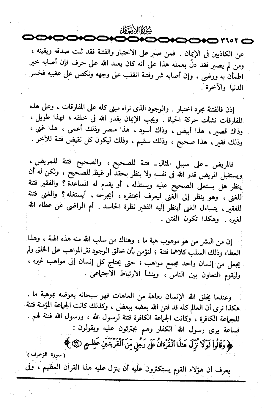وعندما يخلق الله الإنسان بعاهة من العاهات فهو سبحانه يعوضه بموهبة ما. هكذا نرى أن العالم كله قد فتن الله بعضه ببعض، وكذلك كانت الجماعة المؤمنة فتنة للجماعة الكافرة، وكانت الجماعة الكافرة فتنة لرسول الله، ورسول الله فتنة لهم فساعة يرى رسول الله الكفار وهم يجترئون عليه ويقولون: