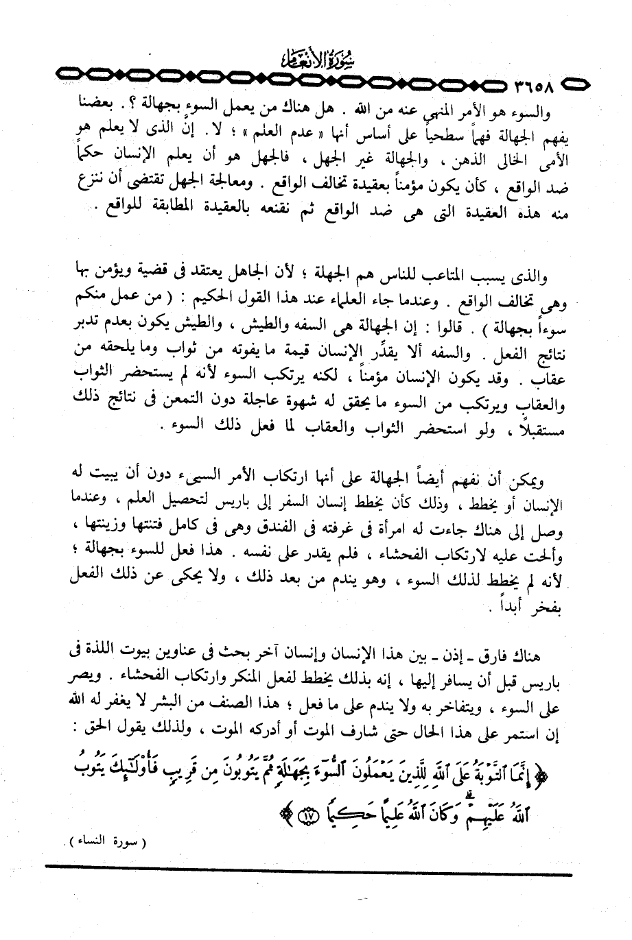 والسوء هو الأمر المنهي عنه من الله. هل هناك من يعمل السوء بجهالة؟ . بعضنا يفهم الجهالة فهماً سطحياً على أساس أنها «عدم العلم» ؛ لا. إنَّ الذي لا يعلم هو الأمي الخالي الذهن، والجهالة غير الجهل، فالجهل هو أن يعلم الإنسان حكماً ضد الواقع، كأن يكون مؤمناً بعقيدة تخالف الواقع. ومعالجة الجهل تقتضي أن ننزع منه هذه العقيدة التي هي ضد الواقع ثم نقنعه بالعقيدة المطابقة للواقع.