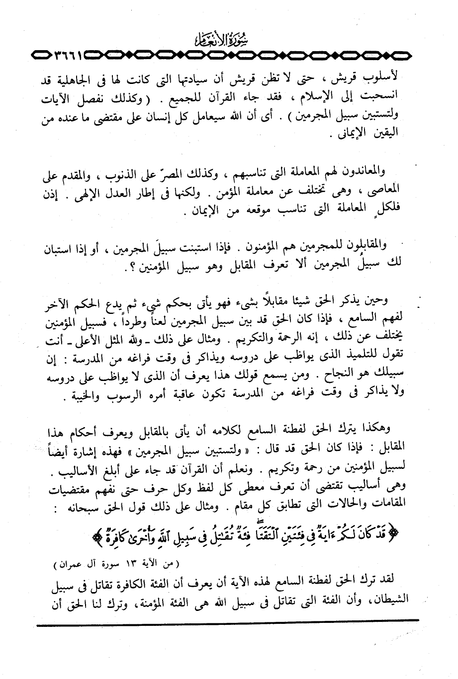 وهكذا يترك الحق لفطنة السامع لكلامه أن يأتي بالمقابل ويعرف أحكام هذا المقابل: فإذا كان الحق قد قال: {وَلِتَسْتَبِينَ سَبِيلُ المجرمين} فهذه إشارة أيضاً لسبيل المؤمنين من رحمة وتكريم. ونعلم أن القرآن قد جاء على أبلغ الأساليب. وهي أساليب تقتضي أن تعرف معطى كل لفظ وكل حرف حتى نفهم مقتضيات المقامات والحالات التي تطابق كل مقام. ومثال على ذلك قول الحق سبحانه: {قَدْ كَانَ لَكُمْ آيَةٌ فِي فِئَتَيْنِ التقتا فِئَةٌ تُقَاتِلُ فِي سَبِيلِ الله وأخرى كَافِرَةٌ} [آل عمران: 13] .