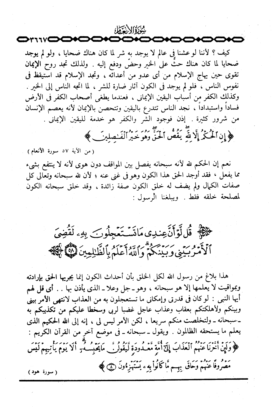 كيف؟ لأننا لو عشنا في عالم لا يوجد به شر لما كان هناك ضحايا، ولو لم يوجد ضحايا لما كان هناك حثٌّ على الخير وحضّ ودفع إليه. ولذلك تجد روح الإيمان تقوي حين يهاج الإسلام من أي عدو من أعدائه، وتجد الإسلام قد استيقظ في نفوس الناس، فلو لم يوجد في الكون آثاره ضارة للشر، لما اتجه الناس إلى الخير. وكذلك الكفر من أسباب اليقين الإيماني، فعندما يطغى أصحاب الكفر في الأرض فساداً واستبداداً، نجد الناس تتدرع باليقين وتتحصن بالإيمان لأنه يعصم الإنسان من شرور كثيرة. إذن فوجود الشر والكفر هو خدمة لليقين الإيماني. {إِنِ الحكم إِلاَّ للَّهِ يَقُصُّ الحق وَهُوَ خَيْرُ الفاصلين} [الأنعام: 57]