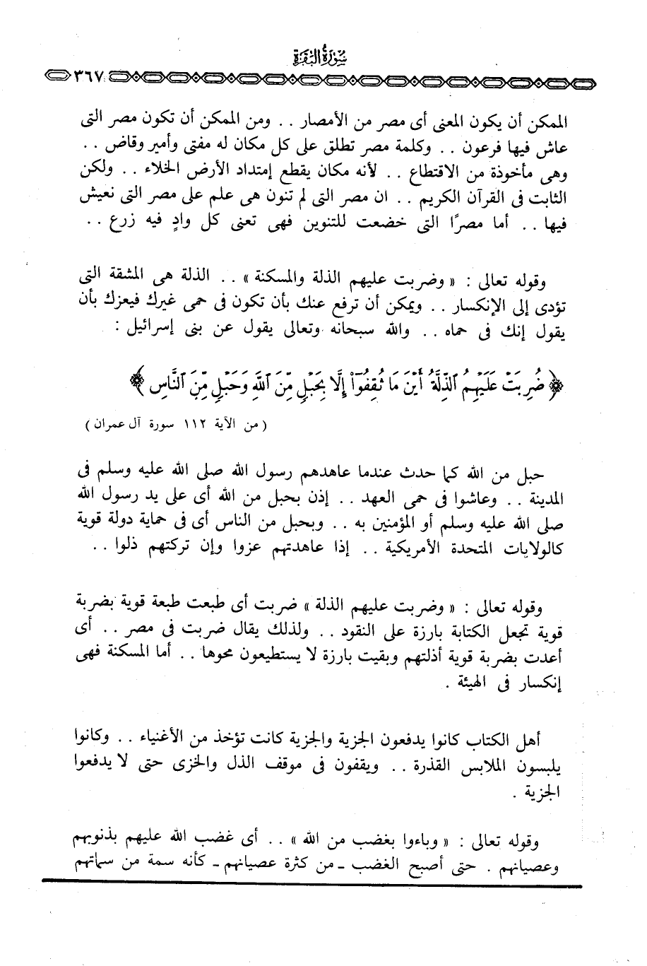 الممكن أن يكون المعنى أي مصر من الأمصار. . ومن الممكن أن تكون مصر التي عاش فيها فرعون. . وكلمة مصر تطلق على كل مكان له مفتي وأمير وقاض. . وهي مأخوذة من الاقتطاع. . لأنه مكان يقطع إمتداد الأرض الخلاء. . ولكن الثابت في القرآن الكريم. . إن مصر التي لم تنون هي علم على مصر التي نعيش فيها. . أما مصراً التي خضعت للتنوين فهي تعني كل وادٍ فيه زرع. .
