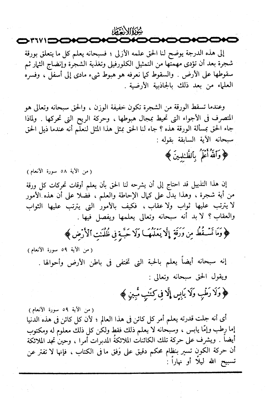 إلى هذه الدرجة يوضح لنا الحق علمه الأزلي؛ فسبحانه يعلم كل ما يتعلق بورقة شجرة بعد أن تؤدي مهمتها من التمثيل الكلورفيلي وتغذية الشجرة وإنضاج الثمار ثم سقوطها على الأرض. والسقوط كما نعرفه هو هبوط شيء مادي إلى أسفل، وفسره العلماء من بعد ذلك بالجاذبية الأرضية.