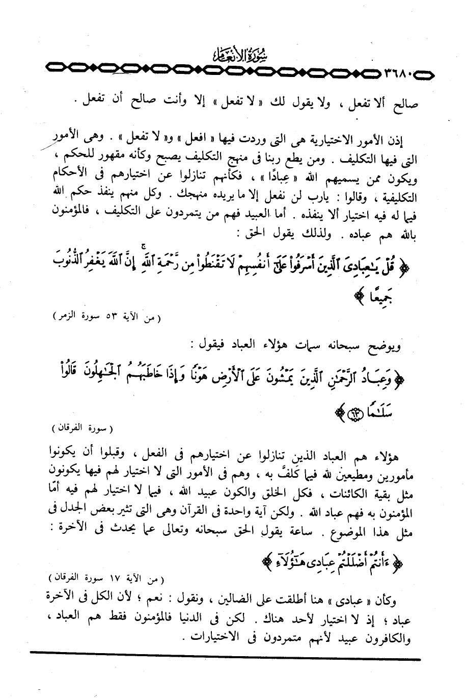 إذن الأمور الاختيارية هي التي وردت فيها «افعل» و «لا تفعل» . وهي الأمور التي فيها التكليف. ومن يطع ربنا في منهج التكليف يصبح وكأنه مقهور للحكم، ويكون ممن يسميهم الله «عباداً» ، فكأنهم تنازلوا عن اختيارهم في الأحكام التكليفية، وقالوا: يارب لن نفعل إلا ما يريده منهجك.