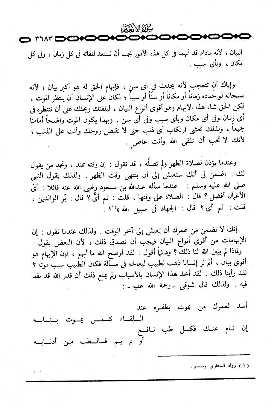 وعندما يؤذن لصلاة الظهر ولم تصلِّه، قد تقول: إن وقته ممتد، وتجد من يقول لك: اضمن لي انك ستعيش إلى أن ينتهي وقت الظهر. «ولذلك يقول النبي صَلَّى اللَّهُ عَلَيْهِ وَسَلَّم َ: عندما سأله عبد الله بن مسعود رَضِيَ اللَّهُ عَنْه قائلا: أيّ الأعمال أفضل؟ قال: الصلاة على وقتها، قلت: ثم أيُّ؟ قال: بّر الوالدين، قلت: ثم أي؟ قال:» الجهاد في سبيل الله «» .