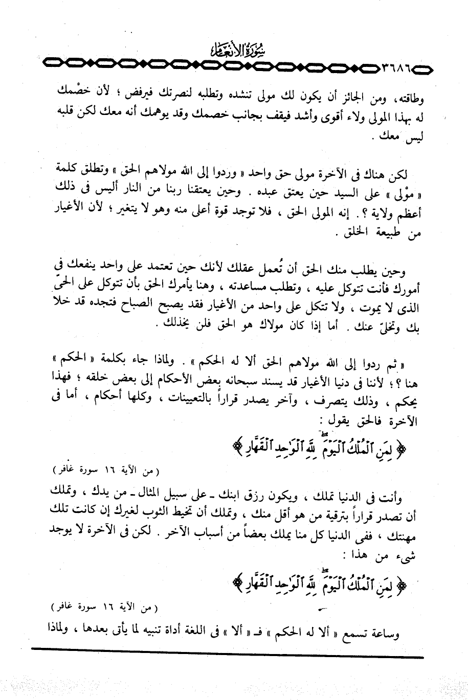 لكن هناك في الآخرة مولى حق واحد {ردوا إلى الله مَوْلاَهُمُ الحق} وتطلق كلمة «موْلى» على السيد حين يعتق عبده. وحين يعتقنا ربنا من النار أليس في ذلك أعظم ولاية؟ . إنه المولى الحق، فلا توجد قوة أعلى منه وهو لا يتغير؛ لأن الأغيار من طبيعة الخلق.