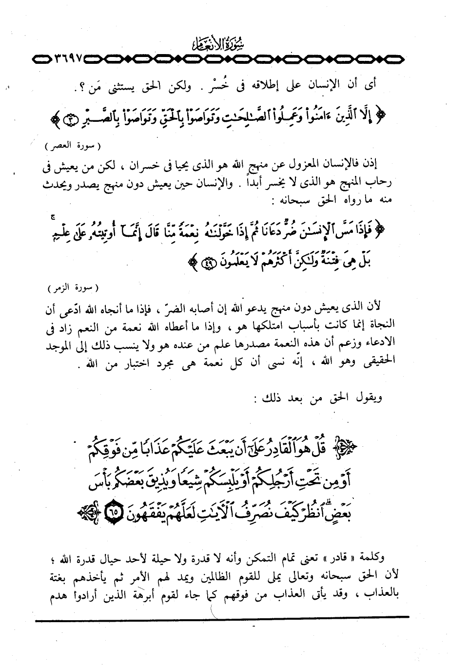 إذن فالإنسان المعزول عن منهج الله هو الذي يحيا في خسران، لكن من يعيش في رحاب المنهج هو الذي لا يخسر أبداً. والإنسانحين يعيش دون منهج يصدر ويحدث منه ما رواه الحق سبحانه: {فَإِذَا مَسَّ الإنسان ضُرٌّ دَعَانَا ثُمَّ إِذَا خَوَّلْنَاهُ نِعْمَةً مِّنَّا قَالَ إِنَّمَآ أُوتِيتُهُ على عِلْمٍ بَلْ هِيَ فِتْنَةٌ ولكن أَكْثَرَهُمْ لاَ يَعْلَمُونَ} [الزمر: 49] .
