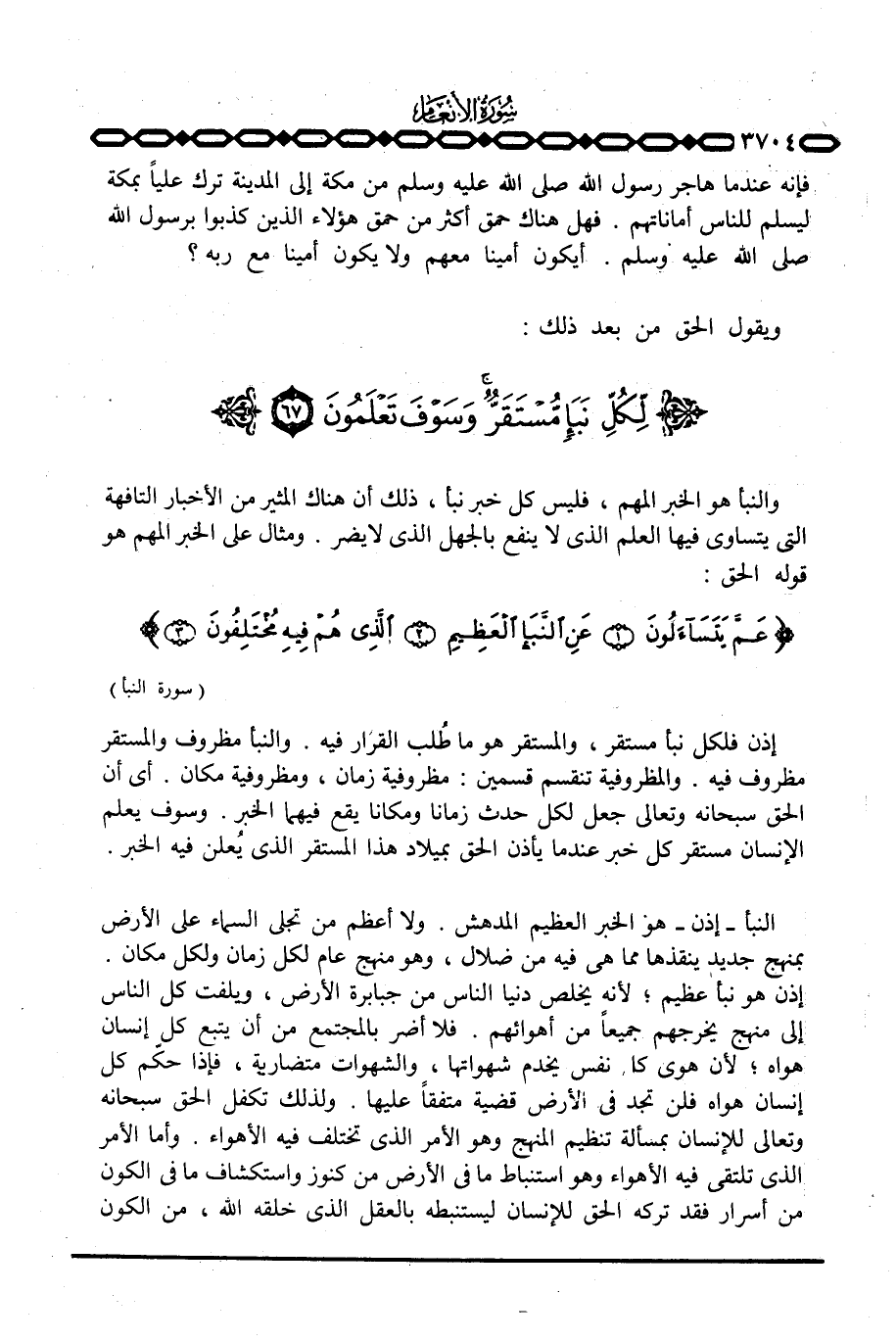 النبأ - إذن - هو الخبر العظيم المدهش. ولا أعظم من تجلي السماء على الأرض بمنهج جديد ينقذها مما هي فيه من ضلال، وهو منهج عام لكل زمان ولكل مكان. إذن هو نبأ عظيم؛ لأنه يخلص دنيا الناس من جبابرة الأرض، ويلفت كل الناس إلى منهج يخرجهم جميعاً من أهوائهم. فلا أضر بالمجتمع من أن يتبع كل إنسان هواه؛ لأن هوى كل نفس يخدم شهواتها، والشهوات متضارية، فإذا حكّم كل إنسان هواه فلن تجد في الأرض قضية متفقاً عليها. ولذلك تكفل الحق سبحانه وتعالى للإنسان بمسألة تنظيم المنهج وهو الأمر الذي تختلف فيه الأهواء. وأما الأمر الذي تلتقي فيه الأهواء وهو استنباط ما في الأرض من كنوز واستكشاف ما في الكون من أسرار فقد تركه الحق للإنسان ليستنبطه بالعقل الذي خلقه الله، من الكون