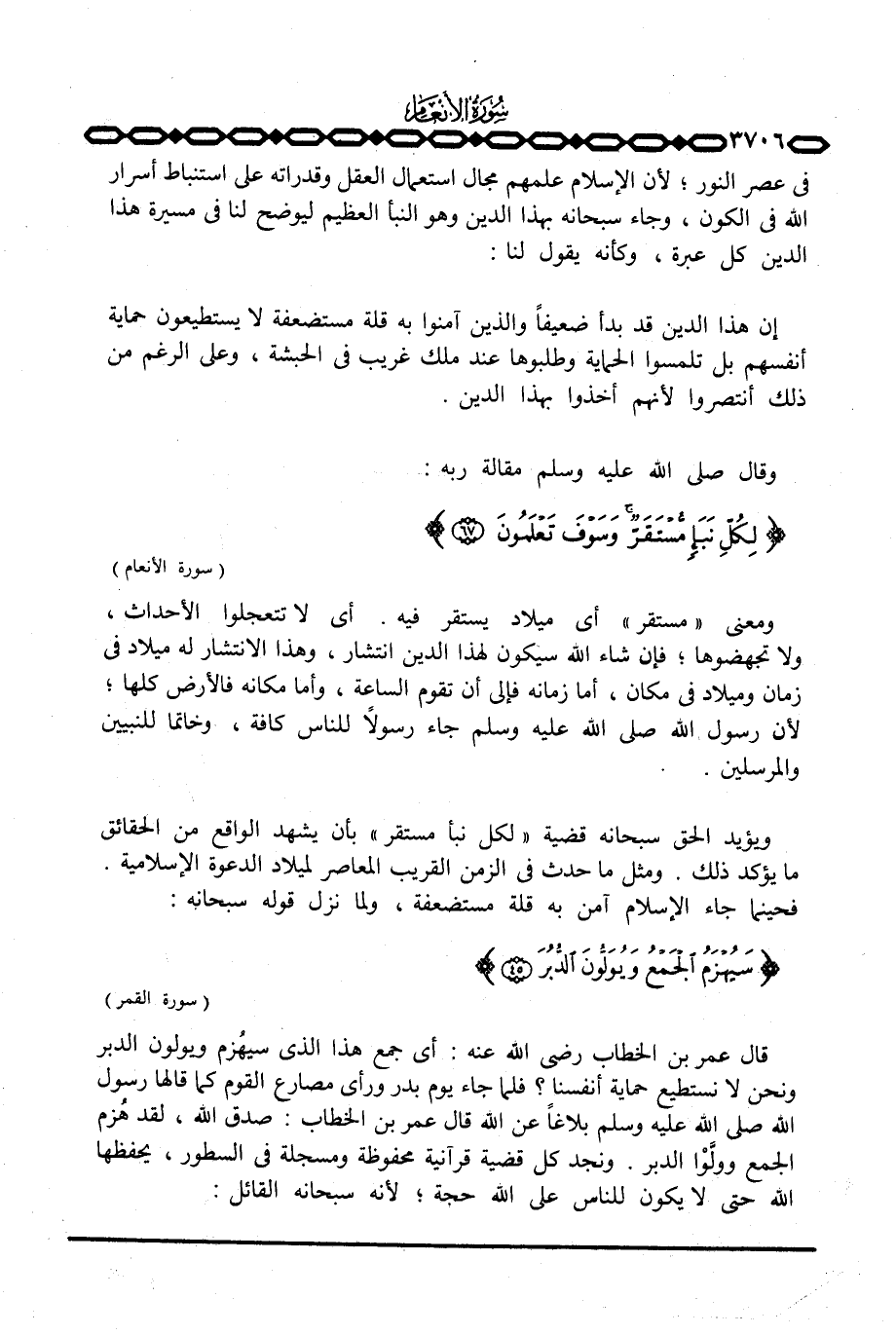 قال عمر بن الخطاب رَضِيَ اللَّهُ عَنْه: أي جمع هذا الذي سيهُزم ويولون الدبر ونحن لا نستطيع حماية أنفسنا؟ فلما جاء يوم بدر ورأى مصارع القوم كما قالها رسول الله صَلَّى اللَّهُ عَلَيْهِ وَسَلَّم َ بلاغاً عن الله قال عمر بن الخطاب: صدق الله، لقد هُزم الجمع وولَّوْا الدبر. ونجد كل قضية قرآنية محفوظة ومسجلة في السطور، يحفظها الله حتى لا يكون للناس على الله حجة؛ لأنه سبحانه القائل: