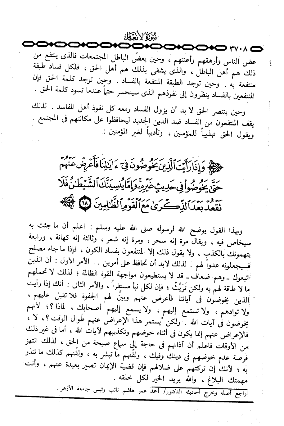 وحين ينتصر الحق لا بد أن يزول الفساد ومعه كل نفوذ أهل المفاسد. لذلك يقف المنتفعون من الفساد ضد الدين الجديد ليحافظوا على مكانتهم في المجتمع. ويقول الحق تهذيباً للمؤمنين، وتأديباً لغير المؤمنين: {وَإِذَا رَأَيْتَ الذين يَخُوضُونَ ... }