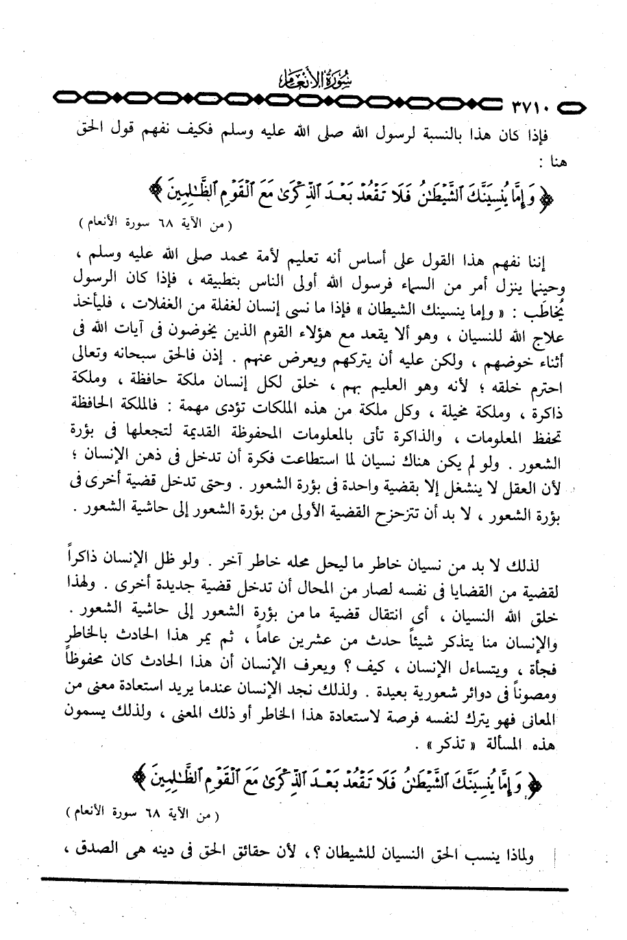 إننا نفهم هذا القول على أساس أنه تعليم لأمة محمد صَلَّى اللَّهُ عَلَيْهِ وَسَلَّم َ، وحينما ينزل أمر من السماء فرسول الله أولى الناس بتطبيقه، فإذا كان الرسول يُخاطَب: {وَإِمَّا يُنسِيَنَّكَ الشيطان} فإذا ما نسي إنسان لغفلة من الغفلات، فليأخذ علاج الله للنسيان، وهو ألا يقعد مع هؤلاء القوم الذين يخوضون في آيات الله في أثناء خوضهم، ولكن عليه أن يتركهم ويعرض عنهم. إذن فالحق سبحانه وتعالى احترم خلقه؛ لأنه وهو العليم بهم، خلق لكل إنسان ملكة حافظة، وملكة ذاكرة، وملكة مخيلة، وكل ملكة من هذه الملكات تؤدي مهمة: فالملكة الحافظة تحفظ المعلومات، والذاكرة تأتي بالمعلومات المحفوظة القديمة لتجعلها في بؤرة الشعور. ولو لم يكن هناك نسيان لما استطاعت فكرة أن تدخل في ذهن الإنسان؛ لأن العقل لا ينشغل إلا بقضية واحدة في بؤرة الشعور. وحتى تدخل قضية أخرى في بؤرة الشعور، لا بد أن تتزحزح القضية الأولى من بؤرة الشعور إلى حاشية الشعور.
