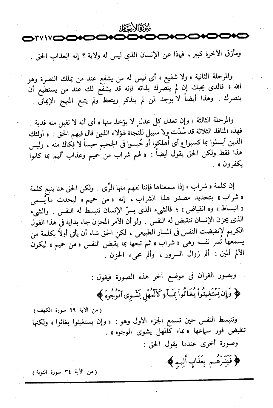 إن كلمة «شراب» إذا سمعناها فإننا نفهم منها الرِّي. ولكن الحق هنا يتبع كلمة «شراب» بتحديد مصدر هذا الشراب، إنه «من حميم» ليحدث ما يُسمى «انبساط» و «انقباض» ؛ فالشيء الذي يسرّ الإنسان تنبسط له النفس. والشيء الذي يحزن الإنسان تنقبض له النفس. ولو أن الأمر المحزن جاء بداية في هذا القول الكريم لانقبضت النفس في المسار الطبيعي، لكن الحق شاء أن يأتي أولاً بكلمة من يسمعها تُسر نفسه وهي «شراب» ثم تبعها بما يقبض النفس «من حميم» ليكون الألم ألمين: ألم زوال السرور، وألم مجيء الحزن.