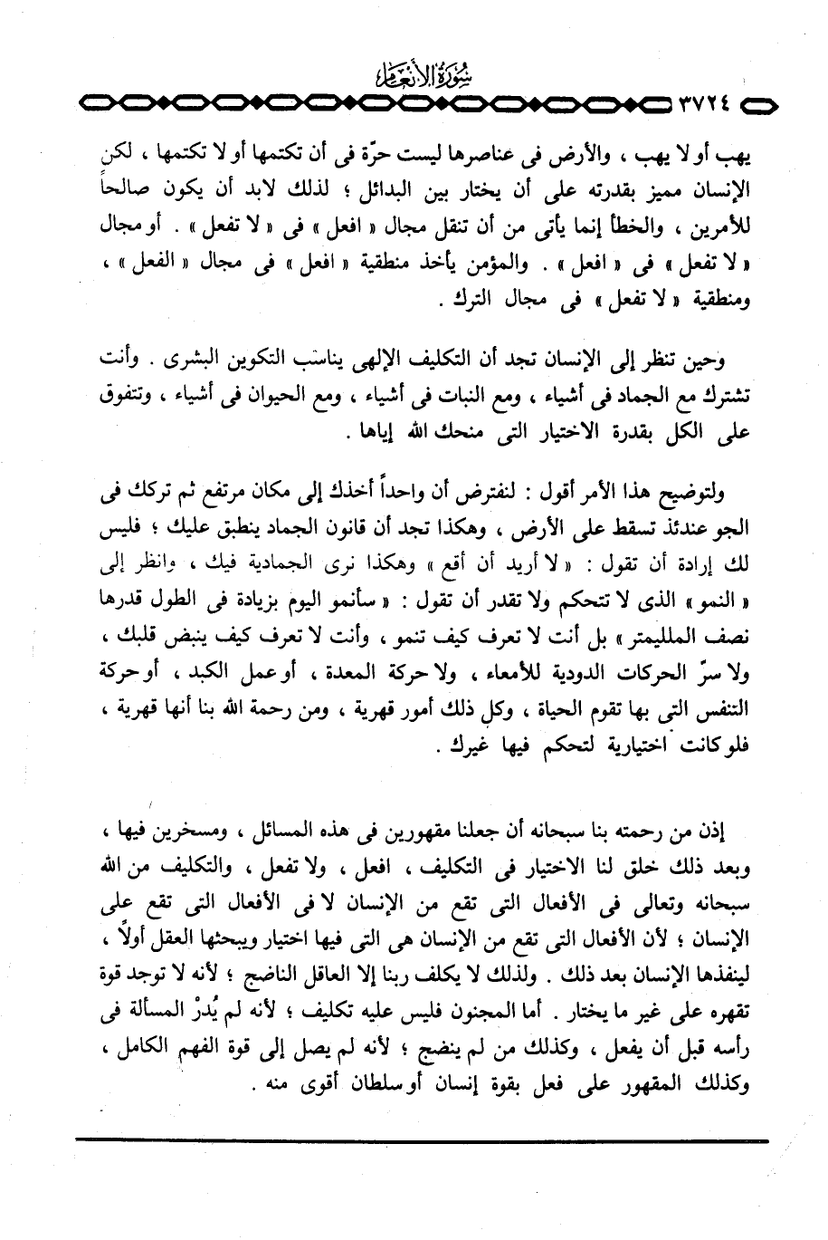 يهب أو لا يهب، والأرض في عناصرها ليست حرّة في أن تكتمها أو لا تكتمها، لكن الإنسان مميز بقدرته على أن يختار بين البدائل؛ لذلك لا بد أن يكون صالحاً للأمرين، والخطأ إنما يأتي من أن تنقل مجال «افعل» في «لا تفعل» . أو مجال «لا تفعل» في «افعل» . والمؤمن يأخذ منطقية «افعل» في مجال «الفعل» ، ومنطقية «لا تفعل» في مجال الترك.