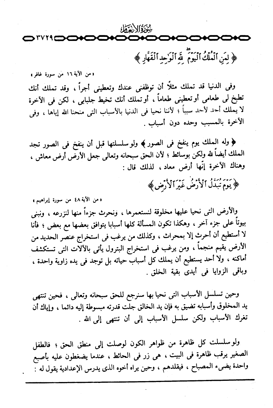 والأرض التي نحيا عليها مخلوقة لنستعمرها، ونحرث جزءاً منها لنزرعه، ونبني بيوتاً على جزء آخر، وهكذا تكون المسألة كلها أسبابا يتوافق بعضها مع بعض؛ فأنا لا أستطيع أن أحرث إلا بمحراث، وكذلك من يرغب في استخراج عنصر الحديد من الأرض يقيم منجماً، ومن يرغب في استخراج البترول يأتي بالآلات التي تستكشف أماكنه، ولا أحد يستطيع أن يملك كل أسباب حياته بل توجد في يده زاوية واحدة، وباقي الزوايا في أيدي بقية الخلق.