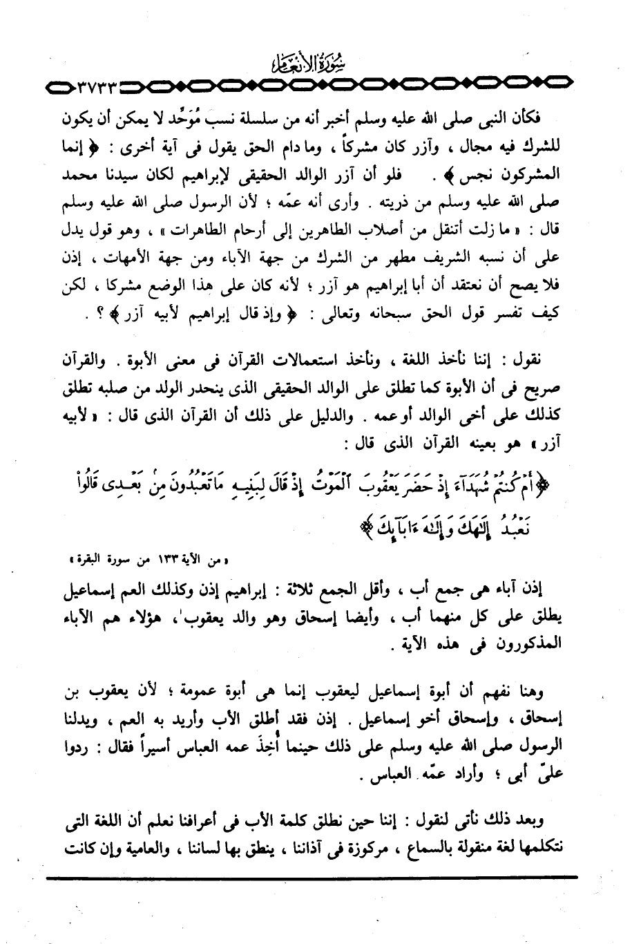 فكأن النبي صَلَّى اللَّهُ عَلَيْهِ وَسَلَّم َ أخبر أنه من سلسلة نسب مُوَحِّد لا يمكن أن يكون للشرك فيه مجال، وآزر كان مشركاً، وما دام الحق يقول في آية أخرى: {إِنَّمَا المشركون نَجَسٌ} . فلو أن آزر الوالد الحقيقي لإبراهيم لكان سيدنا محمد صَلَّى اللَّهُ عَلَيْهِ وَسَلَّم َ من ذريته. وأرى أنه عمّه؛ لأن الرسول صَلَّى اللَّهُ عَلَيْهِ وَسَلَّم َ قال: «ما زلت أتنقل من أصلاب الطاهرين إلى أرحام الطاهرات» ، وهو قول يدل على أن نسبة الشريف مطهر من الشرك من جهة الآباء ومن جهة الأمهات، إذن فلا يصح أن نعتقد أن أبا إبراهيم هو آزر؛ لأنه كان على هذا الوضع مشركا، لكن كيف نفسر قول الحق سبحانه وتعالى: {وَإِذْ قَالَ إِبْرَاهِيمُ لأَبِيهِ آزَرَ} ؟ .