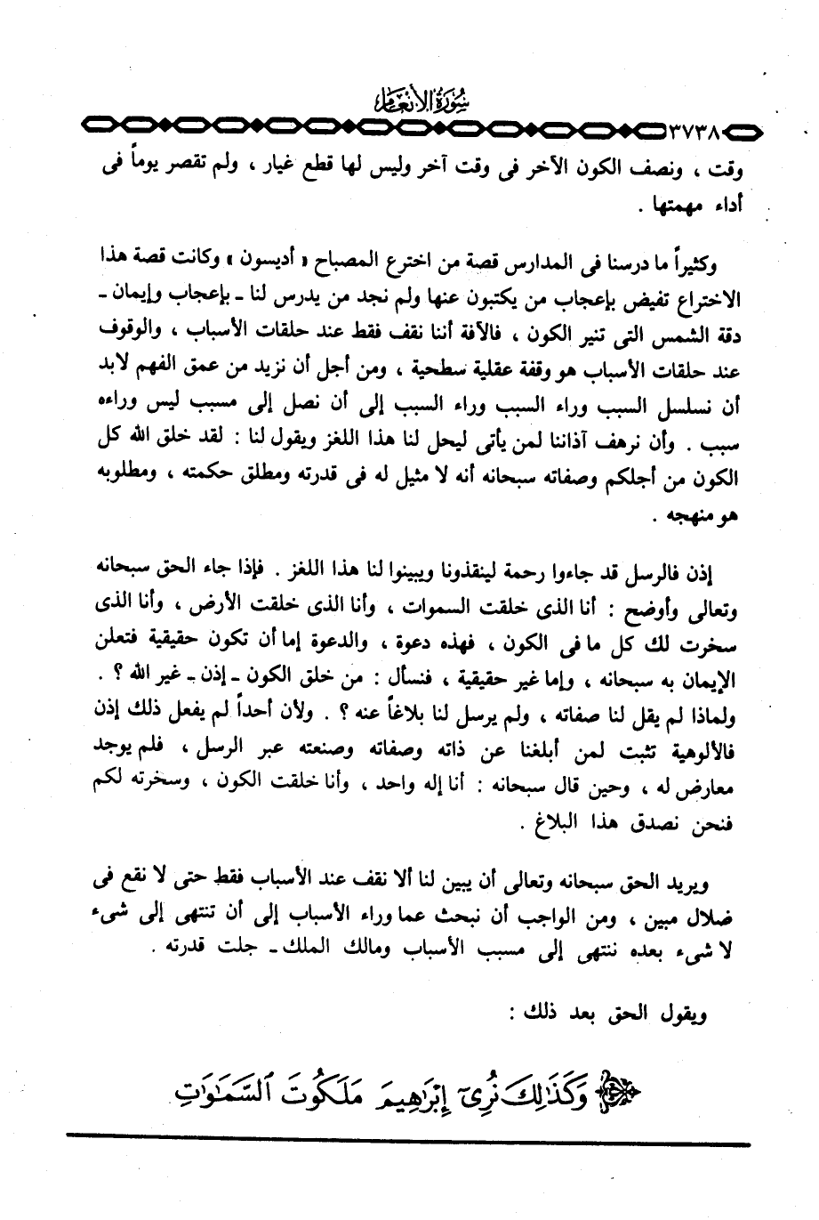 وكثيراً ما درسنا في المدارس قصة من اخترع المصباح «أديسون» وكانت قصة هذا الاختراع تفيض بإعجاب من يكتبون عنها ولم نجد من يدرس لنا - بإعجاب وإيمان - دقة الشمس التي تنير الكون، فالآفة أننا نقف فقط عند حلقات الأسباب، والوقوف عند حلقات الأسباب هو وقفة عقلية سطحية، ومن أجل أن نزيد من عمق الفهم لا بد أن نسلسل السبب وراء السبب وراء السبب إلى أن نصل إلى مسبب ليس وراءه سبب. وأن نرهف آذاننا لمن يأتي ليحل لنا هذا اللغز ويقول لنا: لقد خلق الله كل الكون من أجلكم وصفاته سبحانه أنه لا مثيل له في قدرته ومطلق حكمته، ومطلوبه هو منهجه.