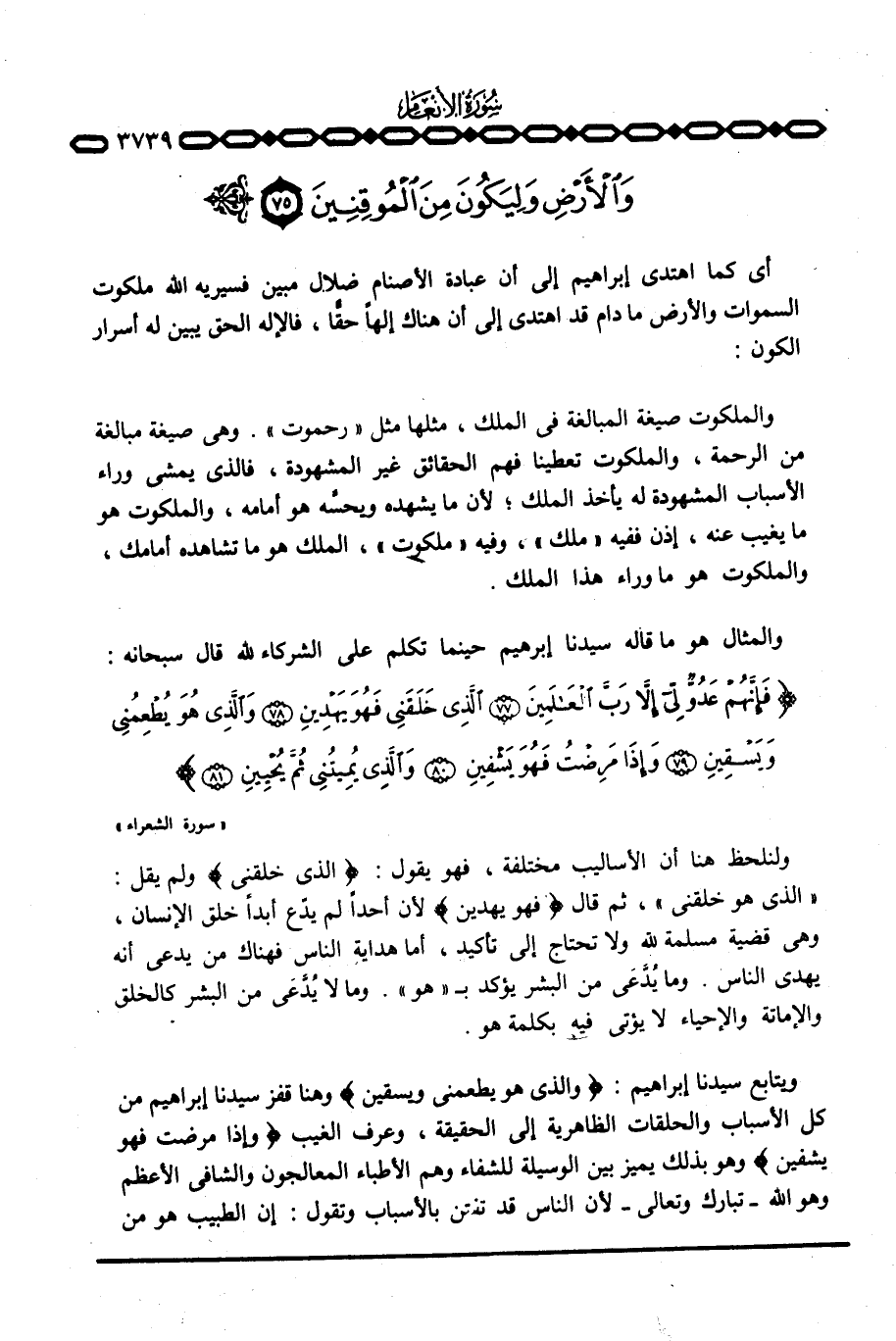 والملكوت صيغة المبالغة في الملك، مثلها مثل «رحموت» . وهي صيغة مبالغة من الرحمة، والملكوت تعطينا فهم الحقائق غير المشهودة، فالذي يمشي وراء الأسباب المشهودة له يأخذ الملك؛ لأن ما يشهده ويحسَّه هو أمامه، والملكوت هو ما يغيب عنه، إذن ففيه «ملك» ، وفيه «ملكوت» ، الملك هو ما تشاهده أمامك، والملكوت هو ما وراء هذا الملك.