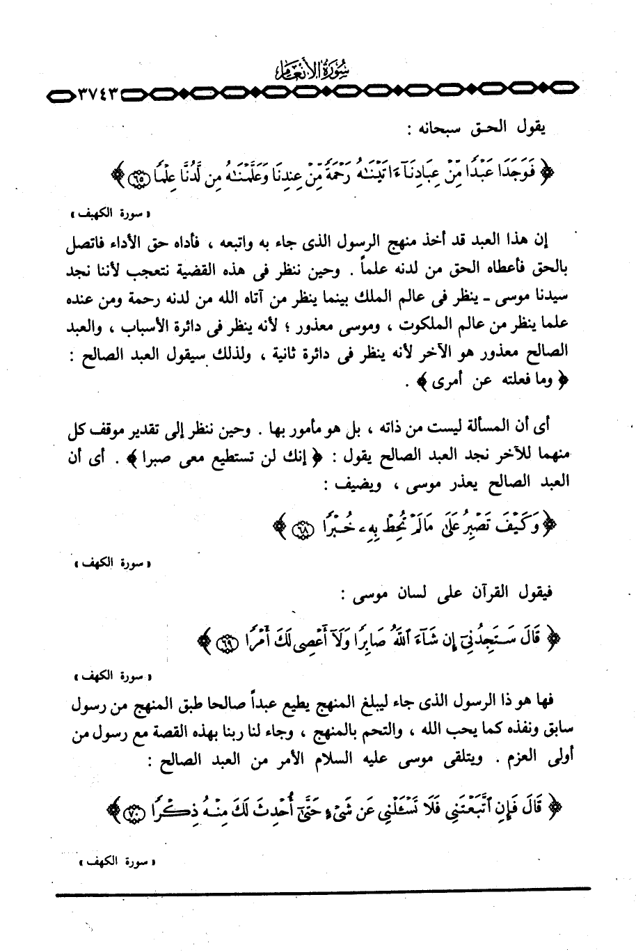 إن هذا العبد قد أخذ منهج الرسول الذي جاء به واتبعه، فأداه حق الأداء فاتصل بالحق فأعطاه الحق من لدنه علماً. وحين ننظر في هذه القضية نتعجب لأننا نجد سيدنا موسى - ينظر في عالم الملك بينما ينظر من آتاه الله من لدنه رحمة ومن عنده علما ينظر من عالم الملكوت، وموسى معذور؛ لأنه ينظر في دائرة الأسباب، والعبد الصالح معذور هو الآخر لأنه ينظر في دائرة ثانية، ولذلك سيقول العبد الصالح: {وَمَا فَعَلْتُهُ عَنْ أَمْرِي} .