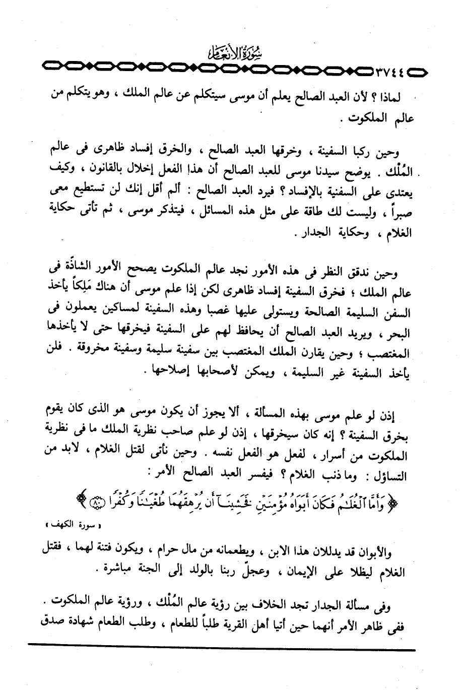 إذن لو علم موسى بهذه المسألة، ألا يجوز أن يكون موسى هو الذي كان يقوم بخرق السفينة؟ إنه كان سيخرقها، إذن لو علم صاحب نظرية الملك ما في نظرية الملكوت من أسرار، لفعل هو الفعل نفسه. وحين نأتي لقتل الغلام، لا بد من التساؤل: وما ذنب الغلام؟ فيفسر العبد الصالح الأمر: {وَأَمَّا الغلام فَكَانَ أَبَوَاهُ مُؤْمِنَيْنِ فَخَشِينَآ أَن يُرْهِقَهُمَا طُغْيَاناً وَكُفْراً} [الكهف: 80]
