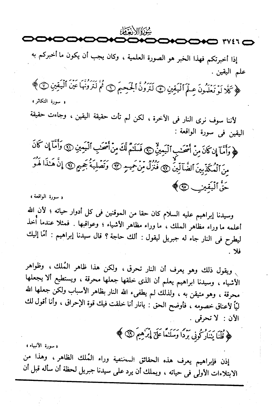وسيدنا إبراهيم عليه السلام كان حقا من الموقنين في كل أدوار حياته؛ لأن الله أعلمه ما وراء مظاهر الملك، ما وراء مظاهر الأشياء؛ وعواقبها. فمثلا عندما أُخذ ليطرح في النار جاء له جبريل ليقول: ألك حاجة؟ قال سيدنا إبراهيم: أمّا إليك فلا.