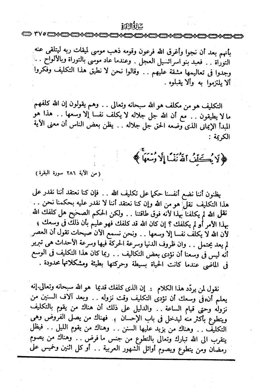 يظنون أننا نضع أنفسنا حكما على تكليف الله. . فإن كنا نعتقد أننا نقدر على هذا التكليف نقل هو من الله وإن كنا نعتقد أننا لا نقدر عليه بحكمنا نحن. . نقل الله لم يكلفنا بهذا لأنه فوق طاقتنا. . ولكن الحكم الصحيح هل كلفك الله بهذا الأمر أو لم يكلفك؟ إن كان الله قد كلفك فهو عليم بأن ذلك في وسعك؛ لأن الله لا يكلف نفسا إلا وسعها.