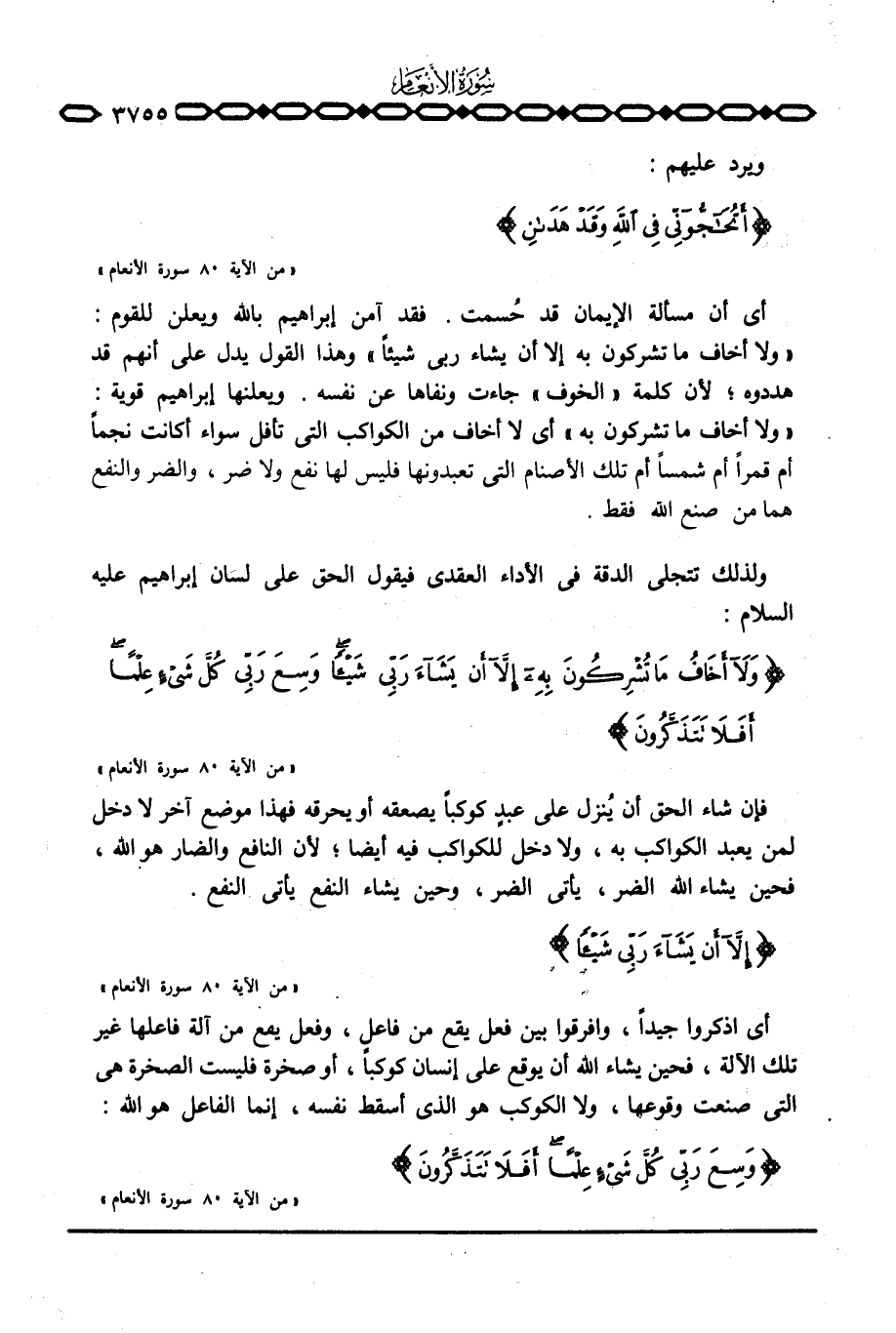 أي أن مسألة الإيمان قد حُسمت. فقد آمن إبراهيم بالله ويعلن للقوم {وَلاَ أَخَافُ مَا تُشْرِكُونَ بِهِ إِلاَّ أَن يَشَآءَ رَبِّي شَيْئاً} وهذا القول يدل على أنهم قد هددوه؛ لأن كلمة «الخوف» جاءت ونفاها عن نفسه. ويعلنها إبراهيم قوية: {وَلاَ أَخَافُ مَا تُشْرِكُونَ بِهِ} أي لا أخاف من الكواكب التي تأفل سواء أكانت نجماً أم قمراً أم شمساً أم تلك الأصنام التي تعبدونها فليس لها نفع ولا ضر، والضر والنفع هما من صنع الله فقط.