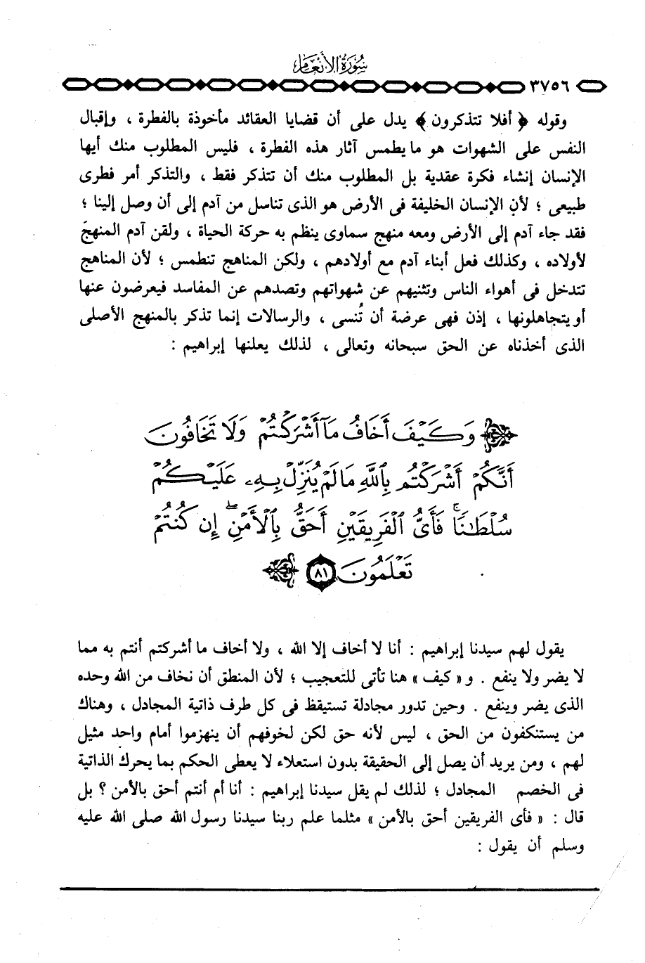 يقول لهم سيدنا إبراهيم: أنا لا أخاف إلا الله، ولا أخاف ما أشركتم أنتم به مما لا يضر ولا ينفع. و «كيف» هنا تأتي للتعجيب؛ لأن المنطق أن نخاف من الله وحده الذي يضر وينفع. وحين تدور مجادلة تستيقظ في كل طرف ذاتية المجادل، وهناك من يستنكفون من الحق، ليس لأنه حق لكن لخوفهم أن ينهزموا أمام واحد مثيل لهم، ومن يريد أن يصل إلى الحقيقة بدون استعلاء لا يعطي الحكم بما يحرك الذاتية في الخصم المجادل؛ لذلك لم يقل سيدنا إبراهيم: أنا أم أنتم أحق بالأمن؟ بل قال: {فَأَيُّ الفريقين أَحَقُّ بالأمن} مثلما علم ربنا سيدنا رسول الله صَلَّى اللَّهُ عَلَيْهِ وَسَلَّم َ أن يقول: