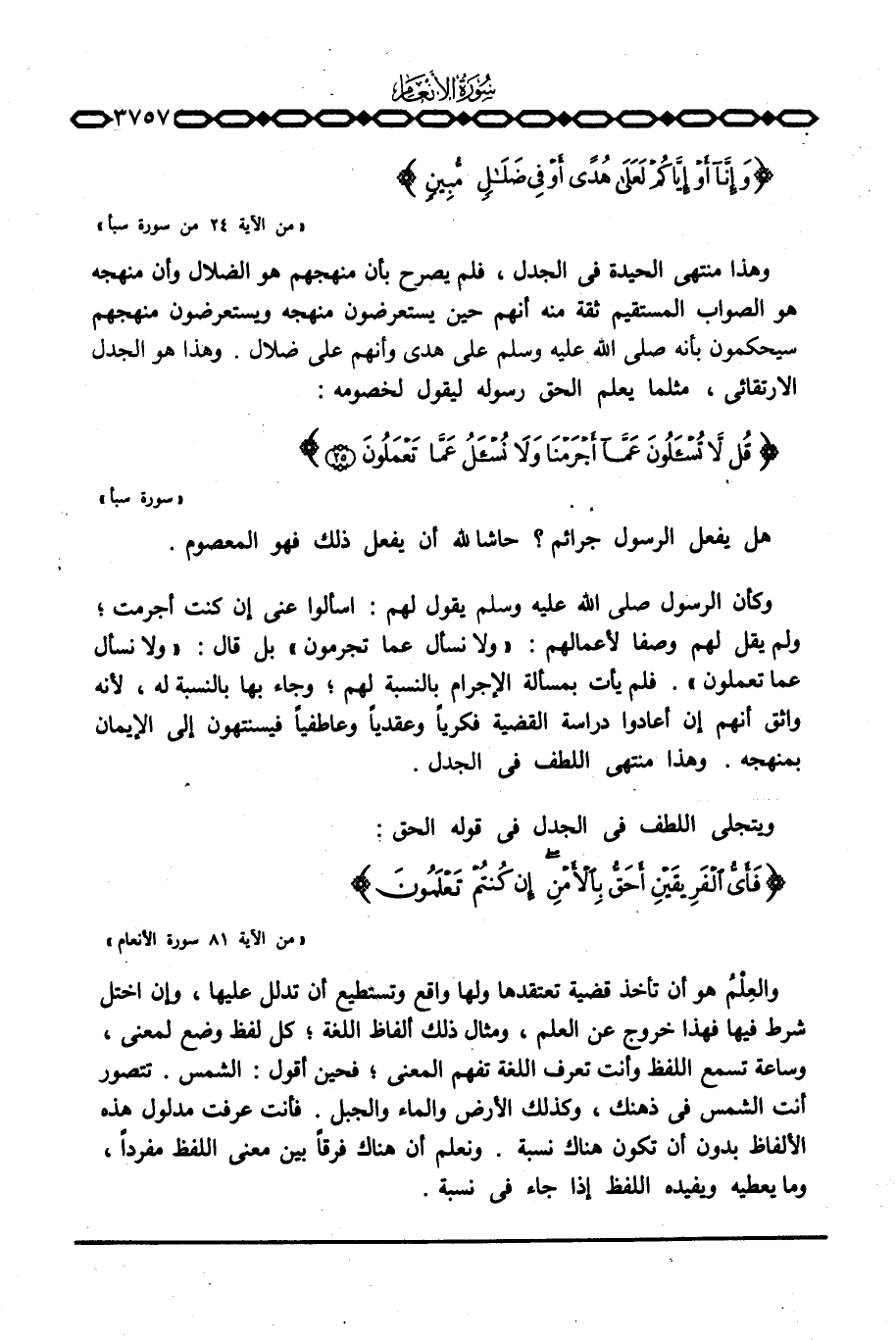 وهذا منتهى الحيدة في الجدل، فلم يصرح بأن منهجهم هو الضلال وأن منهجه هو الصواب المستقيم ثقة منه أنهم حين يستعرضون منهجه ويستعرضون منهجهم سيحكمون بأنه صَلَّى اللَّهُ عَلَيْهِ وَسَلَّم َ على هدى وأنهم على ضلال. وهذا هو الجدل الارتقائي، مثلما يعلم الحق رسوله ليقول لخصومه: {قُل لاَّ تُسْأَلُونَ عَمَّآ أَجْرَمْنَا وَلاَ نُسْأَلُ عَمَّا تَعْمَلُونَ} [سبأ: 25] .
