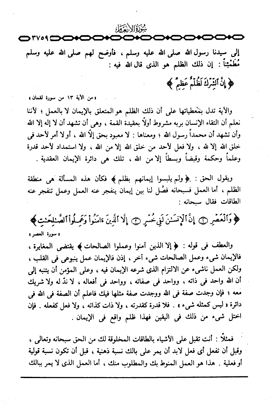 إلى سيدنا رسول الله صَلَّى اللَّهُ عَلَيْهِ وَسَلَّم َ، فأوضح لهم صَلَّى اللَّهُ عَلَيْهِ وَسَلَّم َ مُطَمْئِناً: إن ذلك الظلم هو الذي قال الله فيه: {إِنَّ الشرك لَظُلْمٌ عَظِيمٌ} [لقمان: 13] .