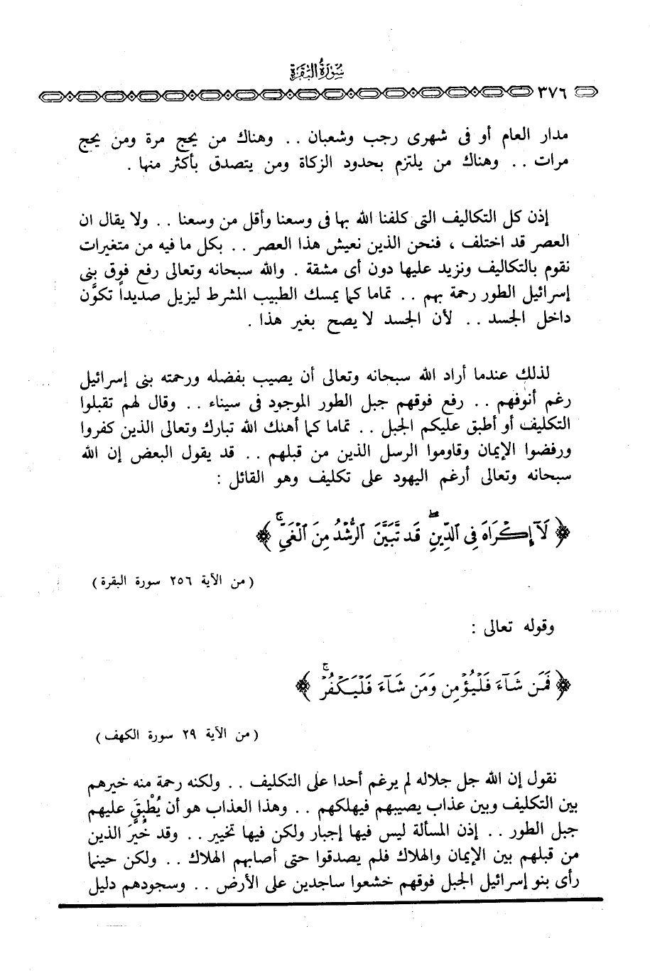 إذن كل التكاليف التي كلفنا الله بها في وسعنا وأقل من وسعنا. . ولا يقال أن العصر قد اختلف، فنحن الذين نعيش هذا العصر. . بكل ما فيه من متغيرات نقوم بالتكاليف ونزيد عليها دون أي مشقة، والله سبحانه وتعالى رفع فوق بني إسرائيل الطور رحمة بهم. . تماما كما يمسك الطبيب المشرط ليزيل صديداً تكوَّن داخل الجسد. . لأن الجسد لا يصح بغير هذا.