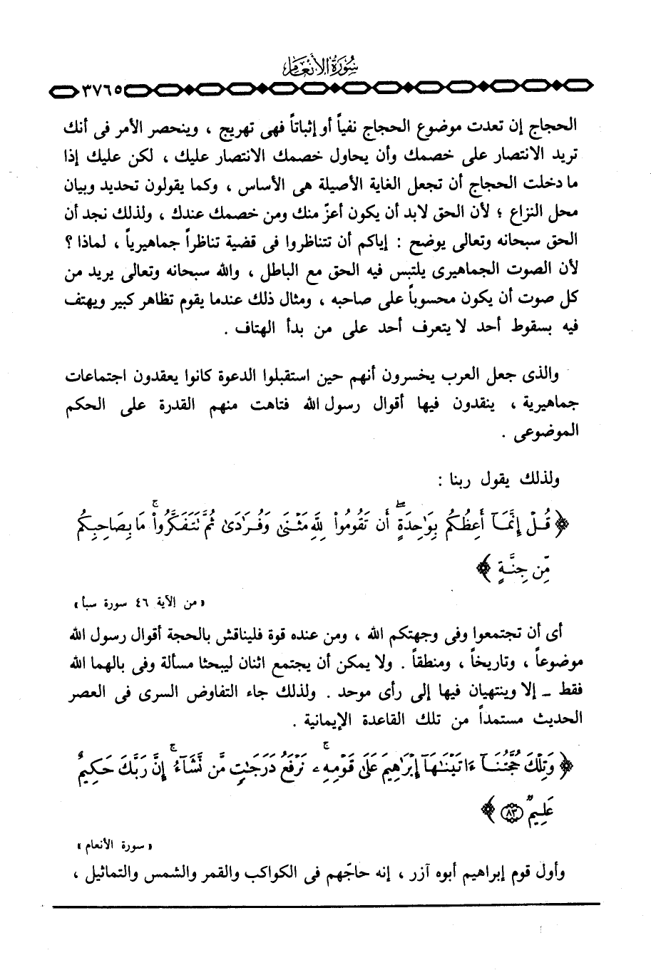 أي أن تجتمعوا وفي وجهتكم الله، ومن عنده قوة فليناقش بالحجة أقوال رسول الله موضوعاً، وتاريخاً، ومنطقاً. ولا يمكن أن يجتمع اثنان ليبحثا مسألة وفي بالهما الله فقط - إلا وينتهيان فيها إلى رأي موحد. ولذلك جاء التفاوض السري في العصر الحديث مستمداً من تلك القاعدة الإيمانية.