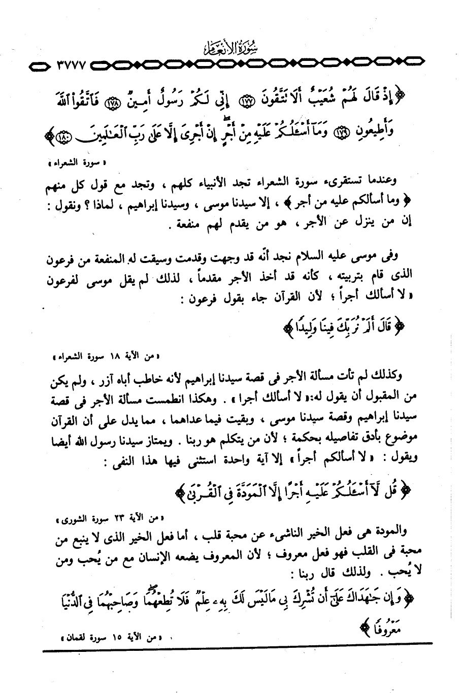 وكذلك لم تأت مسألة الأجر في قصة سيدنا إبراهيم لأنه خاطب أباه آزر، ولم يكن من المقبول أن يقول له:» لا أسألك أجرا «. وهكذا انطمست مسألة الأجر في قصة سيدنا إبراهيم وقصة سيدنا موسى، وبقيت فيما عداهما، مما يدل على أن القرآن موضوع بأدق تفاصيله بحكمة؛ لأن من يتكلم هو ربنا. ويمتاز سيدنا رسول الله أيضا ويقول:» لا أسألكم أجراً «إلا آية واحدة استثنى فيها هذا النفي: {قُل لاَّ أَسْأَلُكُمْ عَلَيْهِ أَجْراً إِلاَّ المودة فِي القربى} [الشورى: 23] .