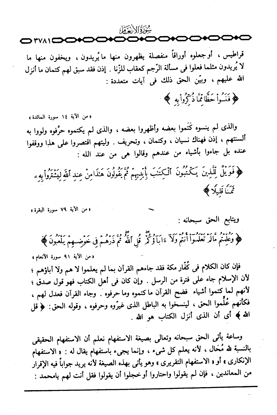قراطيس، أو جعلوه أوراقاً منفصلة يظهرون منها ما يُريدون، ويخفون منها ما لا يُريدون مثلما فعلوا في مسألة الرّجم كعقاب للزّنا. إذن فقد سبق لهم كتمان ما أنزل الله عليهم، وبيّن الحق ذلك في آيات متعددة: {فَنَسُواْ حَظّاً مِّمَّا ذُكِرُواْ بِهِ} [المائدة: 14]