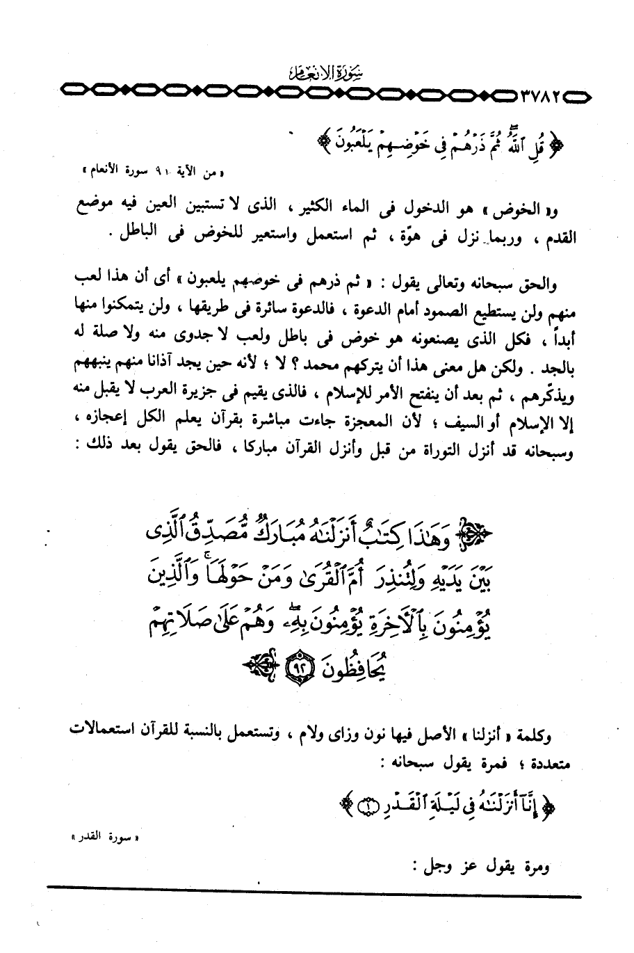 والحق سبحانه وتعالى يقول: {ثُمَّ ذَرْهُمْ فِي خَوْضِهِمْ يَلْعَبُونَ} أي أن هذا لعب منهم ولن يستطيع الصمود أمام الدعوة، فالدعوة سائرة في طريقها، ولن يتمكنوا منها أبداً، فكل الذي يصنعونه هو خوض في باطل ولعب لا جدوى منه ولا صلة له بالجد. ولكن هل معنى هذا أن يتركهم محمد؟ لا؛ لأنه حين يجد آذانا منهم ينبههم ويذكّرهم، ثم بعد أن ينفتح الأمر للإسلام، فالذي يقيم في جزيرة العرب لا يقبل منه إلا الإسلام أو السيف؛ لأن المعجزة جاءت مباشرة بقرآن يعلم الكل إعجازه، وسبحانه قد أنزل التوراة من قبل وأنزل القرآن مباركا، فالحق يقول بعد ذلك: {وهذا كِتَابٌ أَنزَلْنَاهُ ... }