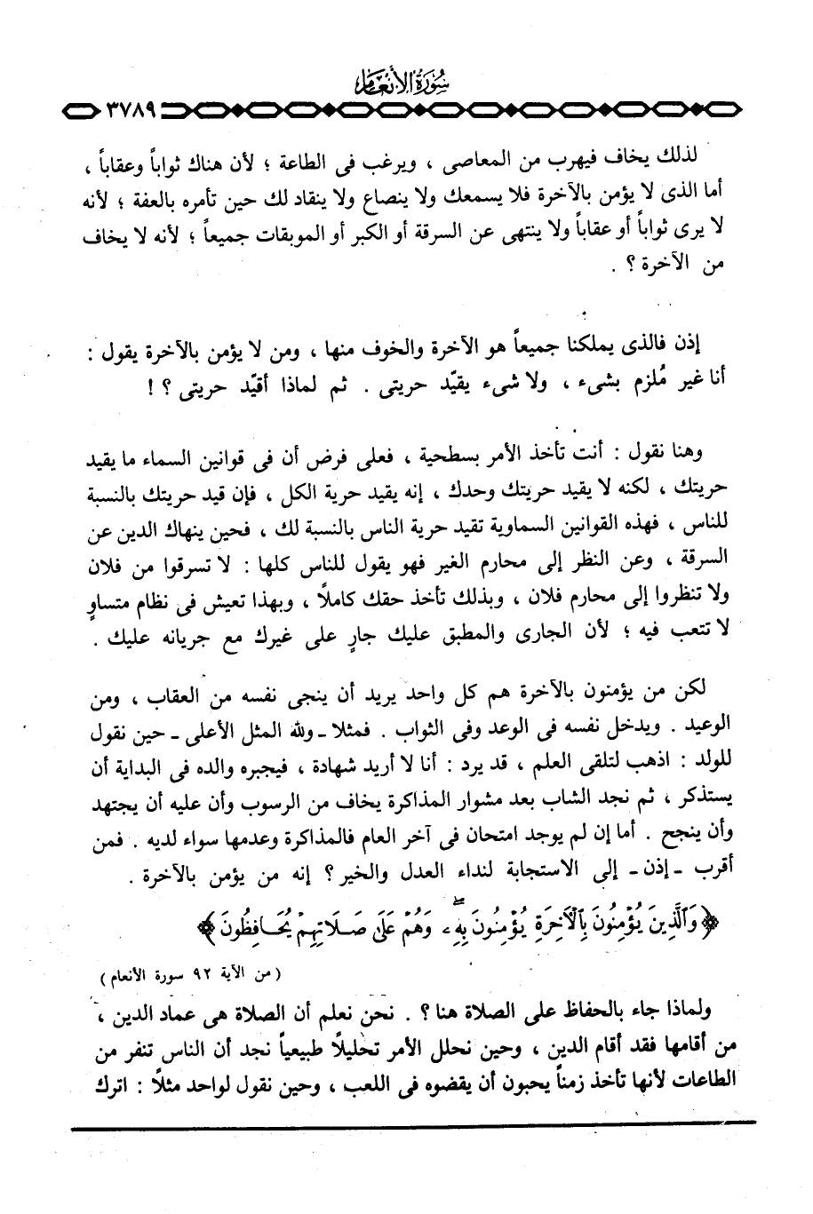 لكن من يؤمنون بالآخرة هم كل واحد يريد أن ينجي نفسه من العقاب، ومن الوعيد. ويدخل نفسه في الوعد وفي الثواب. فمثلاً - ولله المثل الأعلى - حين نقول للولد: اذهب لتلقى العلم، قد يرد: أنا لا أريد شهادة، فيجبره والده في البداية أن يستذكر، ثم نجد الشاب بعد مشوار المذاكرة يخاف من الرسوب وأن عليه أن يجتهد وأن ينجح. أما إن لم يوجد امتحان في آخر العام فالمذاكرة وعدمها سواء لديه. فمن أقرب - إذن - إلى الاستجابة لنداء العدل والخير؟ إنه من يؤمن بالآخرة.