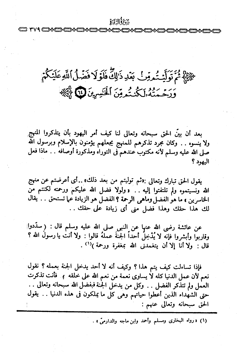 عن عائشة رَضِيَ اللَّهُ عَنْها عن النبي صَلَّى اللَّهُ عَلَيْهِ وَسَلَّم َ قال: «سدّدوا وقاربوا وأبشروا فإنه لا يُدْخِلُ أحداً الجنةَ عملهُ قالوا: ولا أنت يا رسولَ الله؟ قال: ولا أنا إلا أن يتغمدني الله بمغفرة ورحمة»