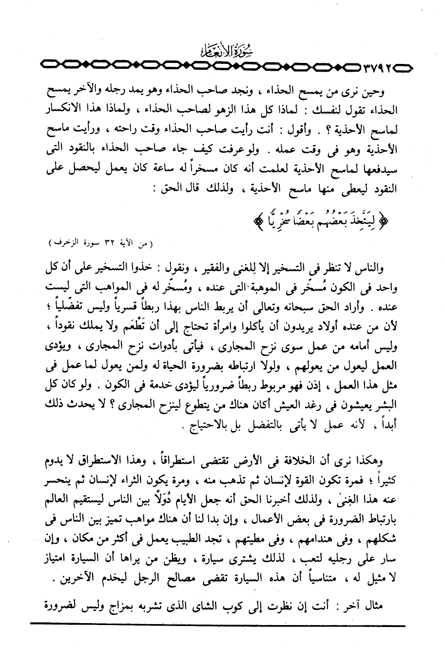 وحين نرى من يمسح الحذاء، ونجد صاحب الحذاء وهو يمد وهو يمد رجله والاخر يمسح الحذاء تقول لنفسك: لماذا كل هذا الزهو لصاحب الحذاء، ولماذا هذا الانكسار لماسح الأحذية؟ . وأقول: أنت رأيت صاحب الحذاء وقت راحته، ورأيت ماسح الأحذية وهو في وقت عمله. ولو عرفت كيف جاء صاحب الحذاء بالنقود التي سيدفعها لماسح الأحذية لعلمت أنه كان مسخراً له ساعة كان يعمل ليحصل على النقود ليعطي مها ماسح الأحذية، ولذلك قال الحق: {لِّيَتَّخِذَ بَعْضُهُم بَعْضاً سُخْرِيّاً} [الزخرف: 32]