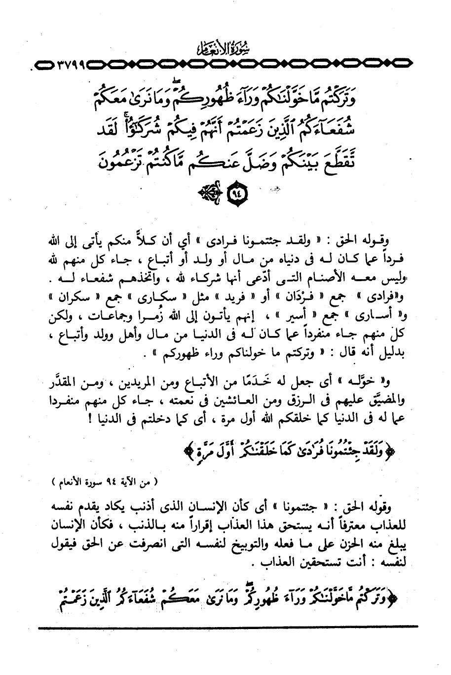 وقوله الحق: {وَلَقَدْ جِئْتُمُونَا فرادى} أي أن كلاًّ منكم يأتي إلى الله فرداً عما كان له في دنياه من مال أو ولد أو أتباع، جاء كل منهم لله وليس معه الأصنام التي أدّعى أنها شركاء لله، واتخذهم شفعاء له. و «فرادى» جمع «فرْدَان» أو «فريد» مثل «سكارى» جمع «سكران» و «أسارى» جمع «أسير» ، إنهم يأتون إلى الله زُمرا وجماعات، ولكن كل منهم جاء منفرداً عما كان له في الدنيا من مال وأهل وولد وأتباع، بدليل أنه قال: {وَتَرَكْتُمْ مَّا خَوَّلْنَاكُمْ وَرَاءَ ظُهُورِكُمْ} .