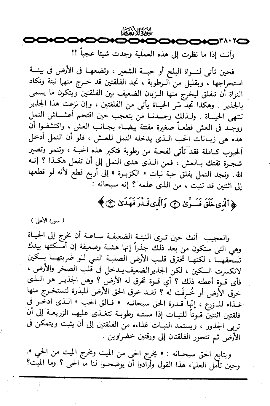 ولذلك وجدنا من يتعجب حين اقتحم أعشاش النمل ووجد في العش قطعاً صغيرة مفتتة بيضاء بجانب العش، واكتشفوا أن هذه هي زبانات الحب الذي يدخله النمل للعش، فلو أن النمل أدخل الحبوب كاملة فقد تأتي لفحة من رطوبة فتكبر هذه الحبة، وتنمو وتصير شجرة تفتك بالعش، فمن الذي هدى النمل إلى أن تفعل هكذا؟ إنه الله. ونجد النمل يفلق حبة نبات «الكزبرة» إلى أربع قطع لأنه لو قطعها إلى اثنتين قد تنبت، من الذي علمه؟ إنه سبحانه: {الذي خَلَقَ فسوى والذي قَدَّرَ فهدى} [الأعلى: 2 - 3] .