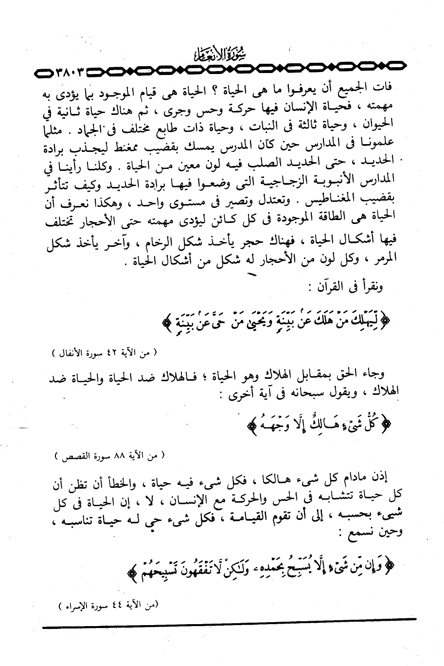 فات الجميع أن يعرفوا ما هي الحياة؟ الحياة هي قيام الموجود بما يؤدي به مهمته، فحياة الإنسان فيها حركة وحس وجري، ثم هناك حياة ثانية في الحيوان، وحياة ثالثة في النبات، وحياة ذات طابع مختلف في الجماد. مثلما علمونا في المدارس حين كان المدرس يمسك بقضيب ممغنط ليجذب برادة الحديد، حتى الحديد الصلب فيه لون معين من الحياة. وكلنا رأينا في المدارس الأنبوية الزجاجية التي وضعوا فيها برادة الحديد وكيف تتأثر بقضيب المغناطيس. وتعتدل وتصير في مستوى واحد، وهكذا نعرف أن الحياة هي الطاقة الموجودة في كل كائن ليؤدي مهمته حتى الأحجار تختلف فيها أشكال الحياة، فهناك حجر يأخذ شكل الرخام، وآخر المرمر، وكل لون من الأحجار له شكل من أشكال الحياة.