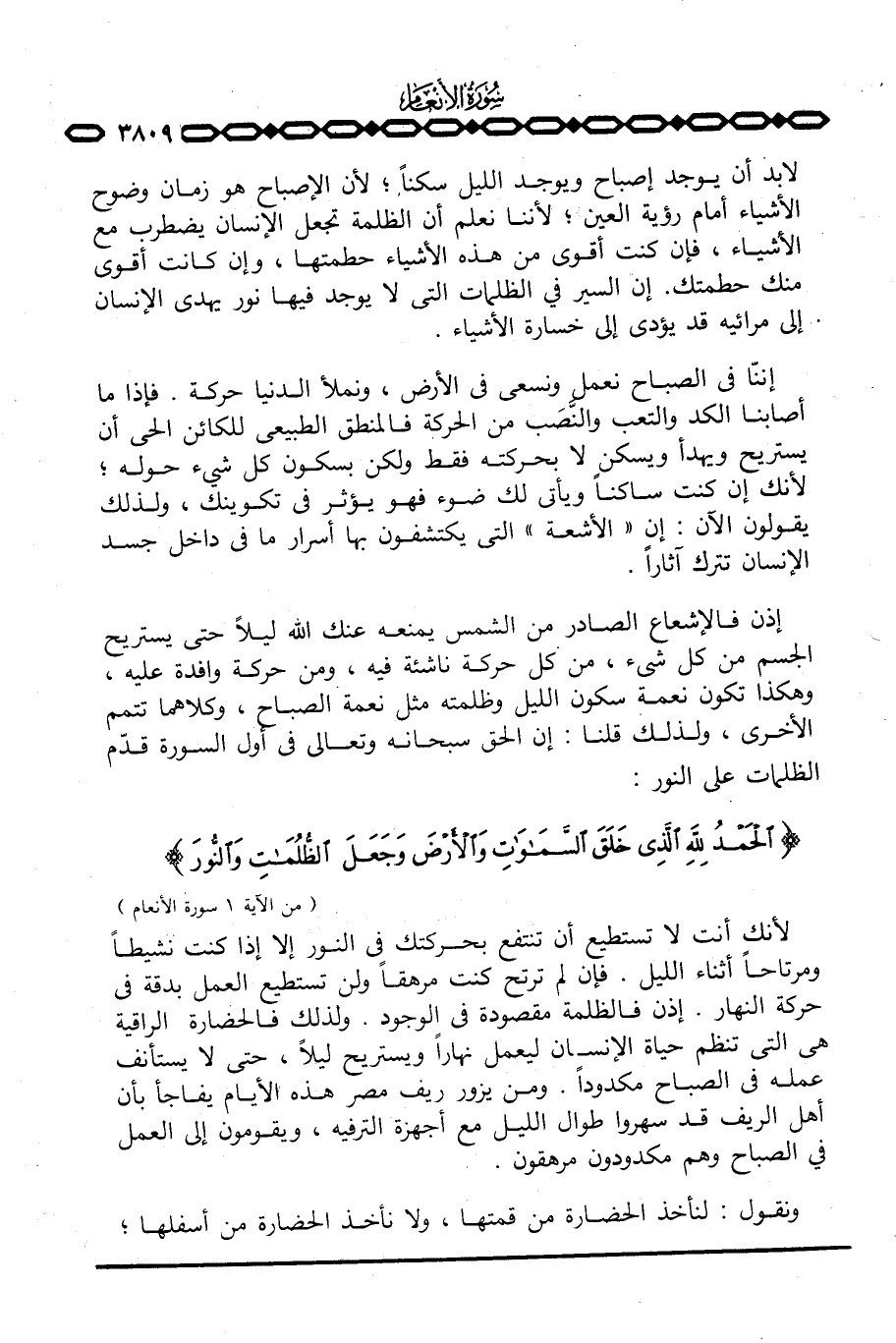 لأنك لا تستطيع أن تنتفع بحركتك في النور إلا إذا كنت نشيطاً ومرتاحاً أثناء الليل. فإن لم ترتح كنت مرهقاً ولن تستطيع العمل بدقة في حركة النهار. إذن فالظلمة مقصودة في الوجود. ولذلك فالحضارة الراقية هي التي تنظم حياة الإنسان ليعمل نهارا ويستريح ليلاً، حتى لا يستأنف عمله في الصباح مكدوداً. ومن يزور ريف مصر هذه الأيام يفاجأ بأن أهل الريف قد سهروا طوال الليل مع أجهزة الترفيه، ويقومون إلى العمل في الصباح وهم مكدودون مرهقون.