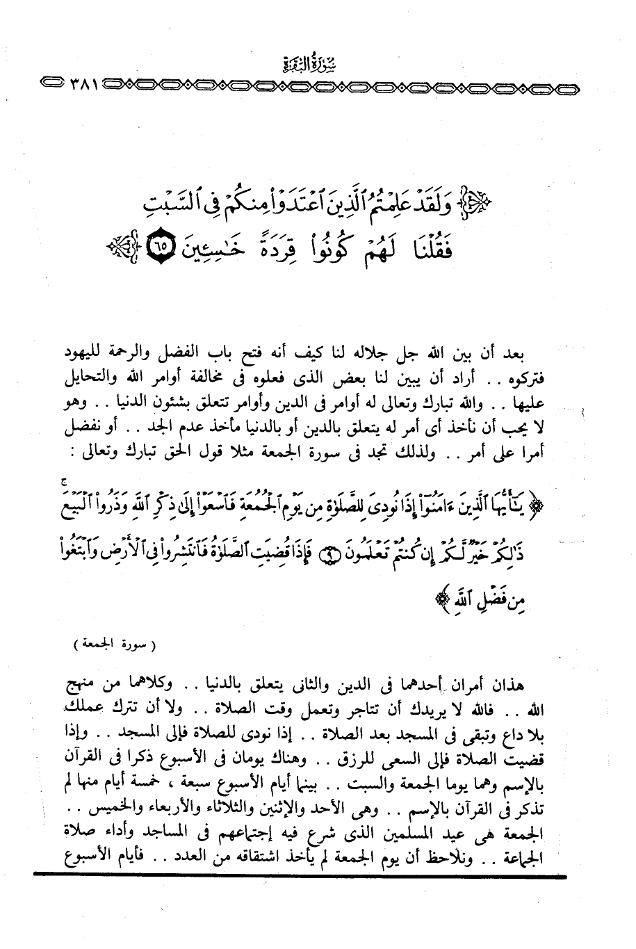 بعد أن بين الله جل جلاله لنا كيف أنه فتح باب الفضل والرحمة لليهود فتركوه. . أراد أن يبين لنا بعض الذي فعلوه في مخالفة أوامر الله والتحايل عليها. . والله تبارك وتعالى له أوامر في الدين وأوامر تتعلق بشئون الدنيا. . وهو لا يحب أن نأخذ أي أمر له يتعلق بالدين أو بالدنيا مأخذ عدم الجد. . أو نفضل أمرا على أمر. . ولذلك تجد في سورة الجمعة مثلا قول الحق تبارك وتعالى: {ياأيها الذين آمنوا إِذَا نُودِيَ لِلصَّلاَةِ مِن يَوْمِ الجمعة فاسعوا إلى ذِكْرِ الله وَذَرُواْ البيع ذَلِكُمْ خَيْرٌ لَّكُمْ إِن كُنتُمْ تَعْلَمُونَ فَإِذَا قُضِيَتِ الصلاة فانتشروا فِي الأرض وابتغوا مِن فَضْلِ الله} [الجمعة: 9 - 10]