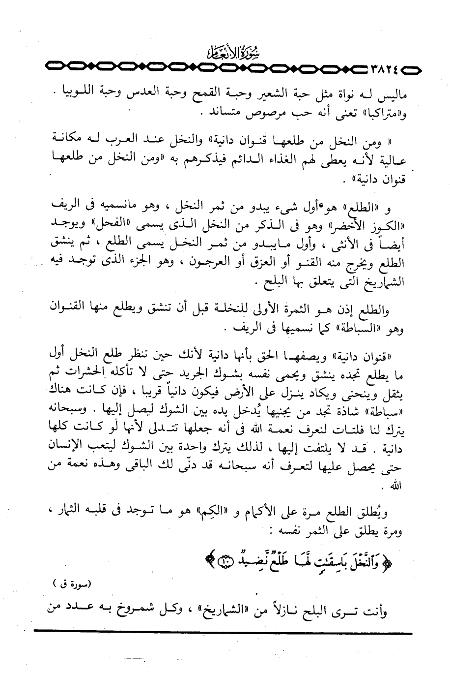 {وَمِنَ النخل مِن طَلْعِهَا قِنْوَانٌ دَانِيَةٌ} والنخل عند العرب له مكانة عالية لأنه يعطي لهم الغذاء الدائم فيذكرهم به {وَمِنَ النخل مِن طَلْعِهَا قِنْوَانٌ دَانِيَةٌ} .