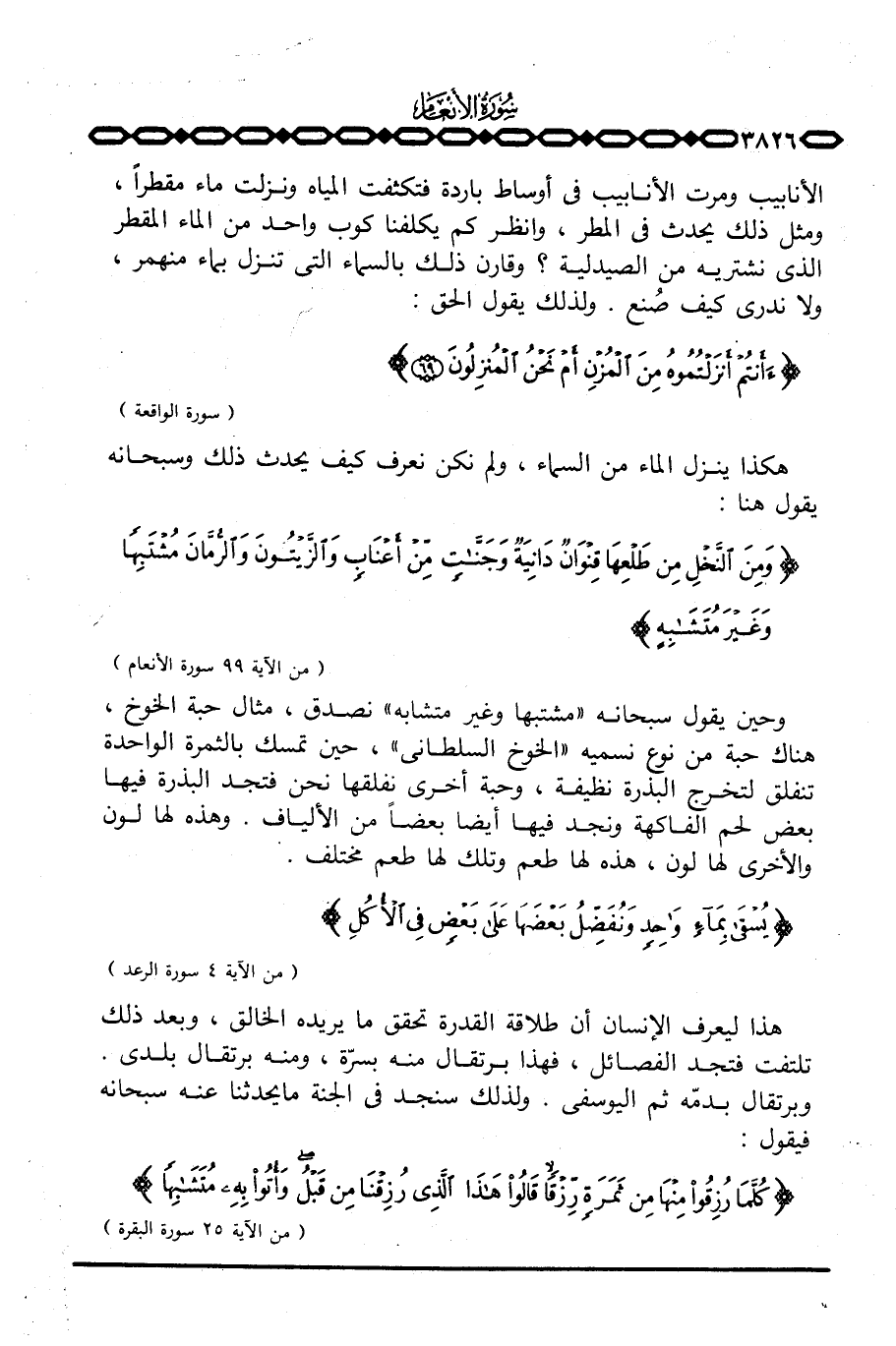 هذا ليعرف الإنسان أن طلاقة القدرة تحقق ما يريده الخالق، وبعد ذلك تلتفت فتجد الفصائل، فهذا برتقال منه بسرّة، ومنه برتقال بلدي. وبرتقال بدمّه ثم اليوسفي. ولذلك سنجد في الجنة ما يحدثنا عنه سبحانه فيقول: {كُلَّمَا رُزِقُواْ مِنْهَا مِن ثَمَرَةٍ رِّزْقاً قَالُواْ هذا الذي رُزِقْنَا مِن قَبْلُ وَأُتُواْ بِهِ مُتَشَابِهاً} [البقرة: 25] .