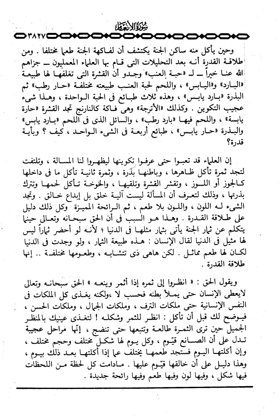 وحين يأكل منه ساكن الجنة يكتشف أن لفاكهة الجنة طعما مختلفا. ومن طلاقة القدرة أنه بعد التحليلات التي قام بها العلماء المعمليون - جزاهم الله عنا خيراً - ل «حبة العنب» وجدوا أن القشرة التي تغلفها لها طبيعة «البارد» و «اليابس» ، واللحم لحبة العنب طبيعته مختلفة «حار رطب» ثم البذرة «بارد يابس» ، وهذه ثلاث طبائع في الحبة الواحدة، وهذا شيء عجيب التكوين. وكذلك «الأترجة» وهي فاكة كالنارنج تجد القشرة «حارة يابسة» ، واللحم فيها «بارد رطب» ، والسائل الذي في اللحم «بارد يابس» والبذرة «حار يابس» ، طبائع أربعة في الشيء الواحد، كيف؟ وبأية قدرة؟